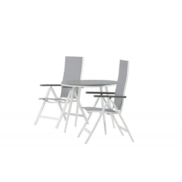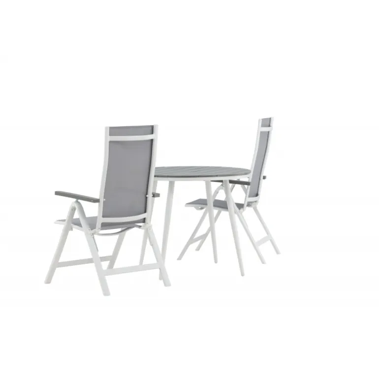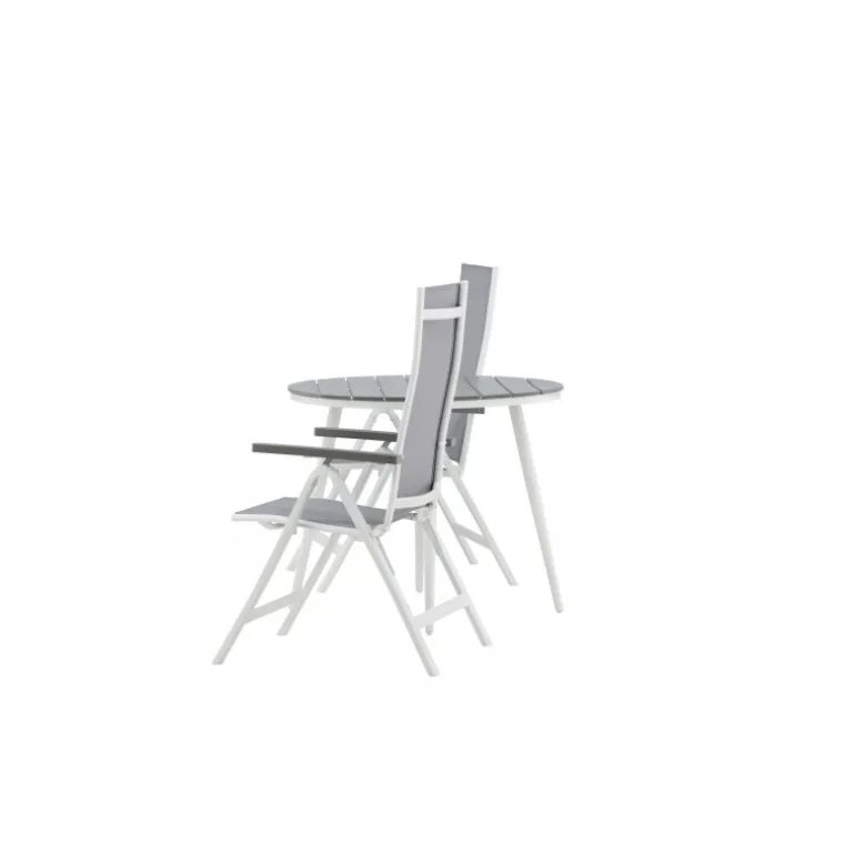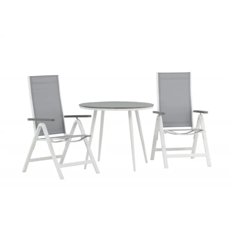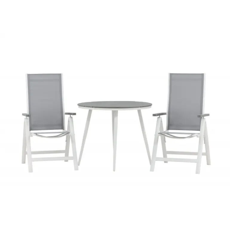 Skab det perfekte kaffested på din terrasse denne sommer! Her kombineres tidløst design med indbydende former i en smuk blikfang. Spisebordet Break har en grå bordplade i grå Aintwood og et klassisk hvidt aluminiumsstel. Her i lækker kombination med 2 spisestole fra Albany-serien. Stolen er en grå 5-positions stol i tekstil med lækre armlæn og hvid aluminiumsramme. Ryglænet er foldbart for optimal komfort og afslapning – sæt morgenmad eller aftenkaffe ud og nyd sommerdagene!