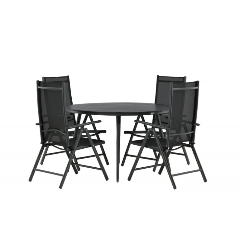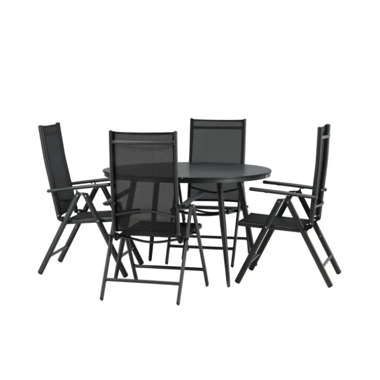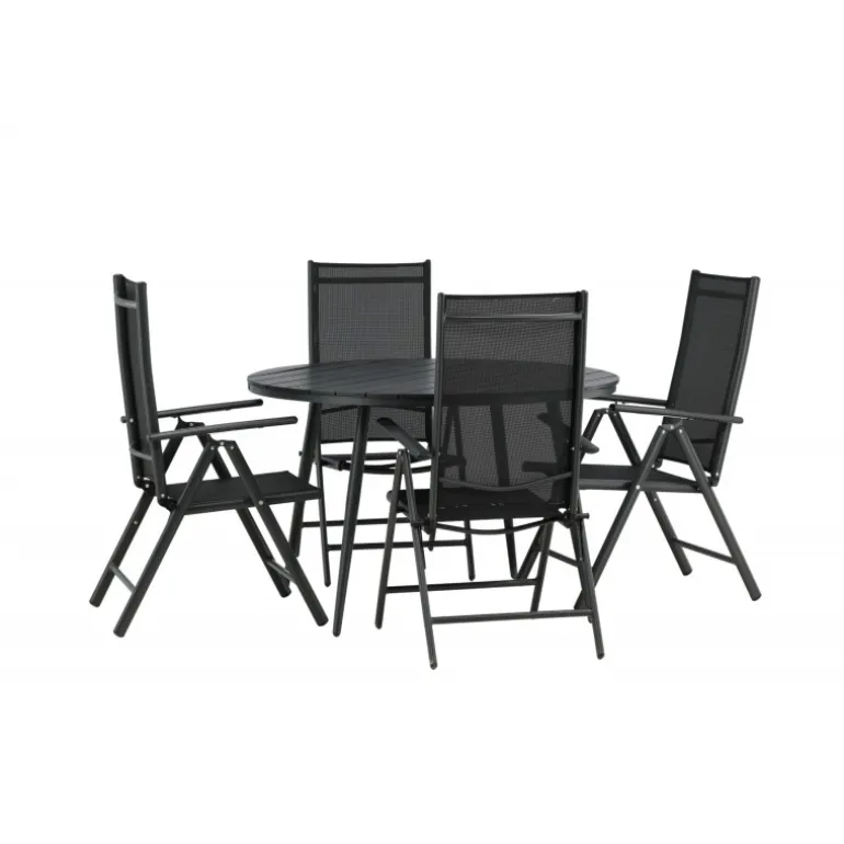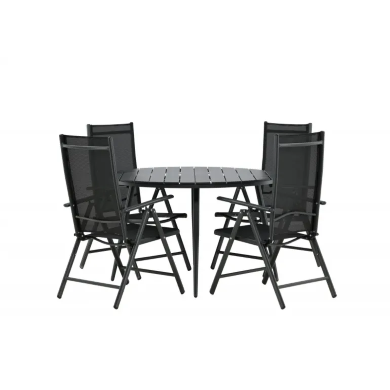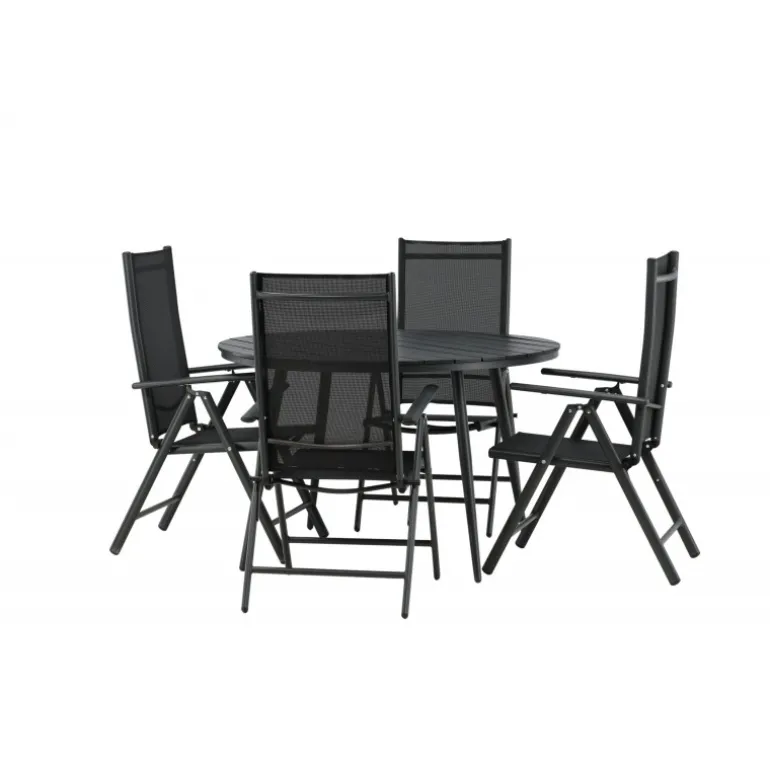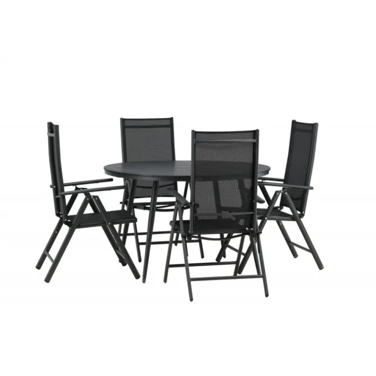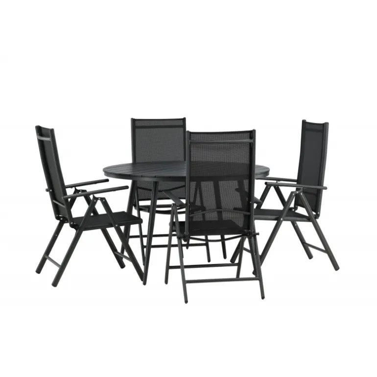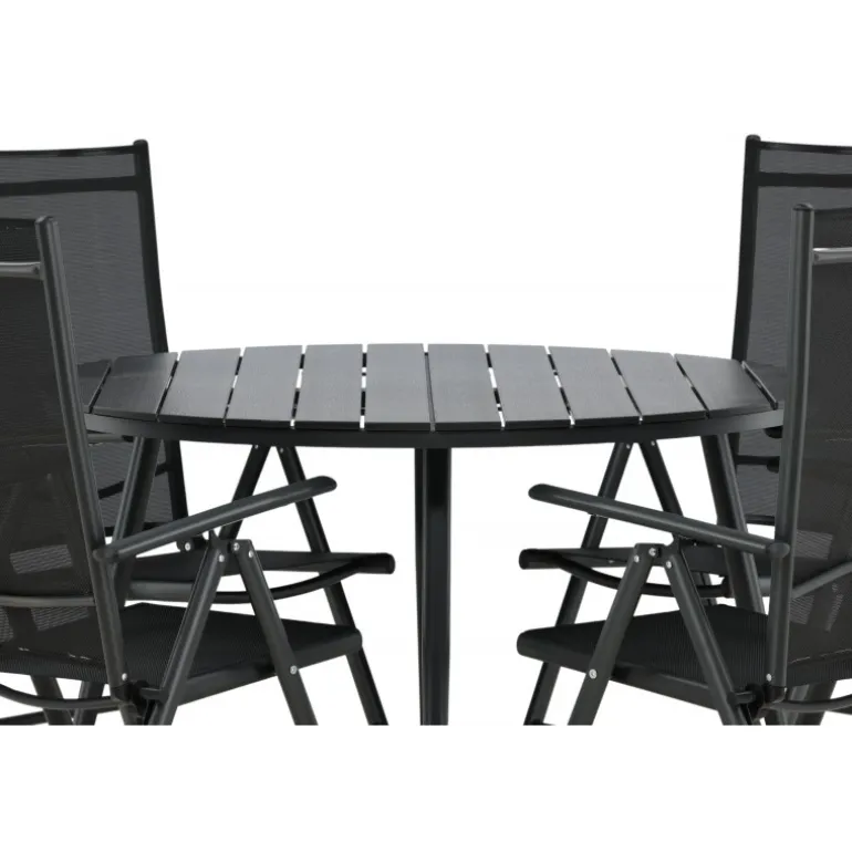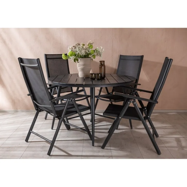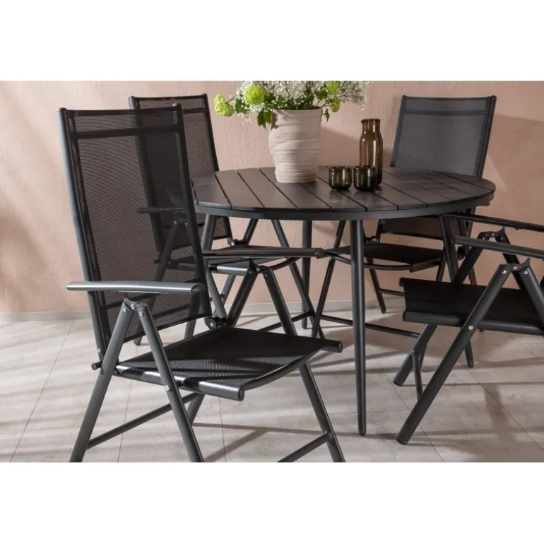 Et konsistent sort madgruppe i moderne design går aldrig af mode – let at matche og tidløst i sit design! Break-bordet har en rund bordplade i Aintwood og et klassisk understel i sort aluminium. Her i perfekt kombination med foldbare spisebordsstole fra samme serie. Ryglænene på stolene i sort tekstil kan justeres for optimal komfort og afslapning omkring spisebordet. Skab det perfekte centrum på din terrasse!