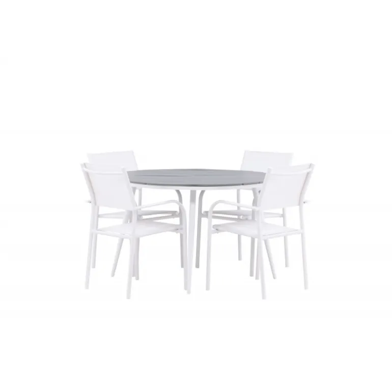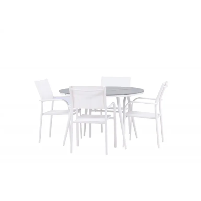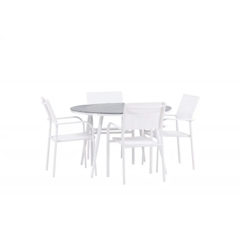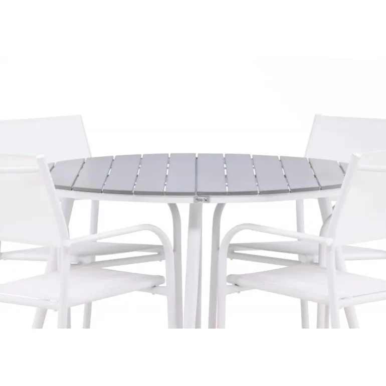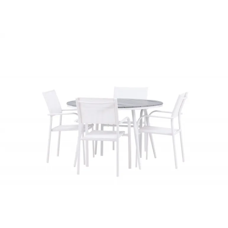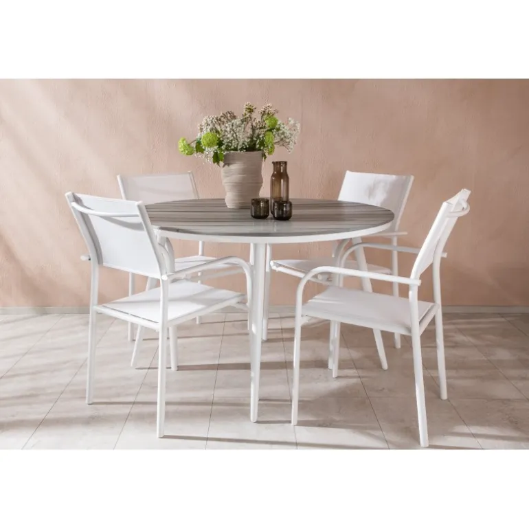 Det perfekte sted til alle sommerens måltider! Break-bordet har et klassisk design med en rund grå Aintwood-bordplade og et hvidt aluminiumsstel. Dimensioner: 120ø cm. Her i moderne kombination med 4 spisestole fra serien Santorini. Stolene har lige, nordiske former med integrerede armlæn i aluminium og sæde i hvidt tekstil. De er også stabelbare for praktisk opbevaring. Skab en hyggelig spiseplads på terrassen!
