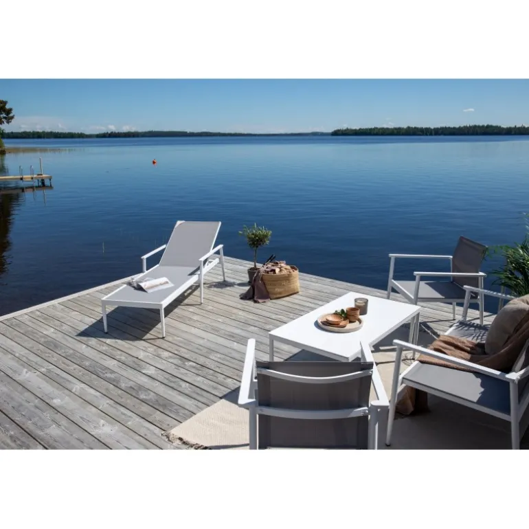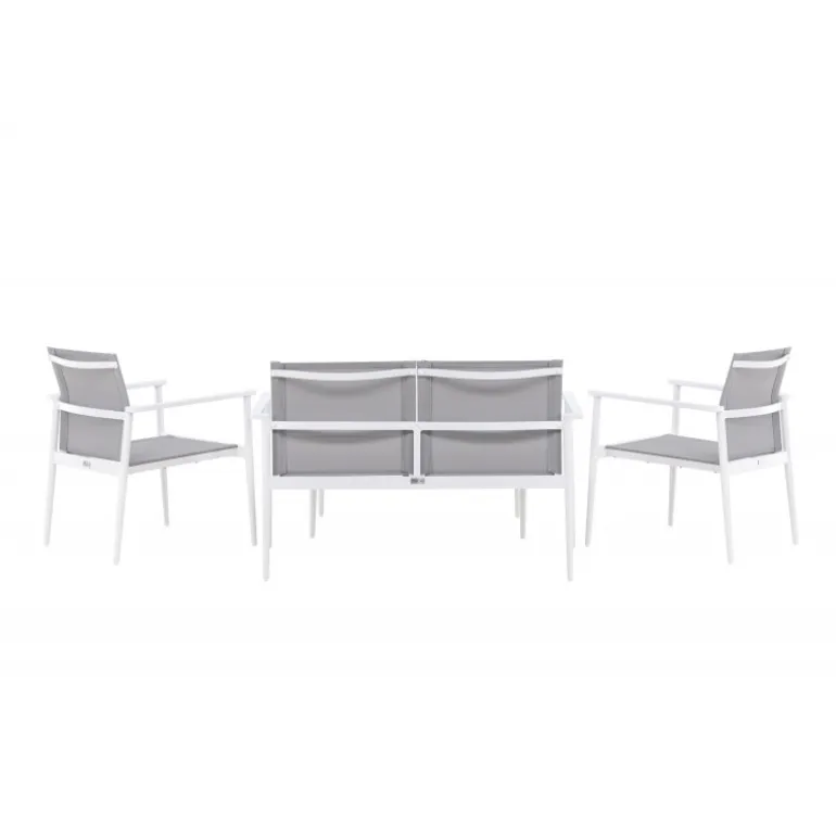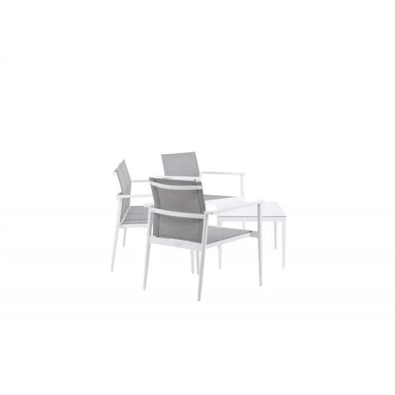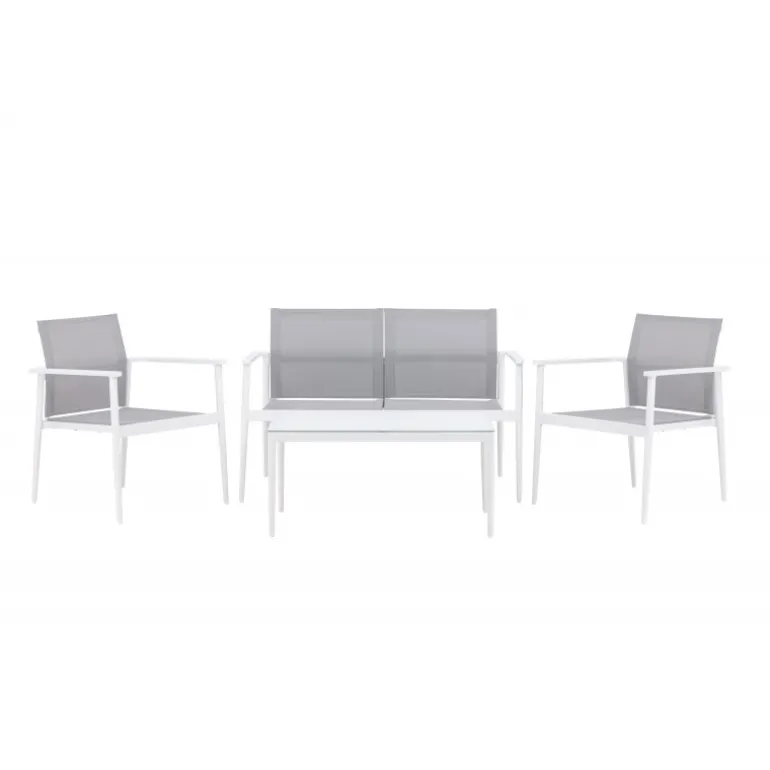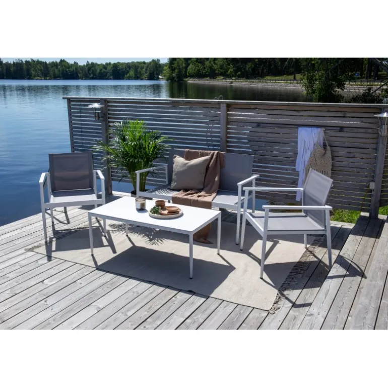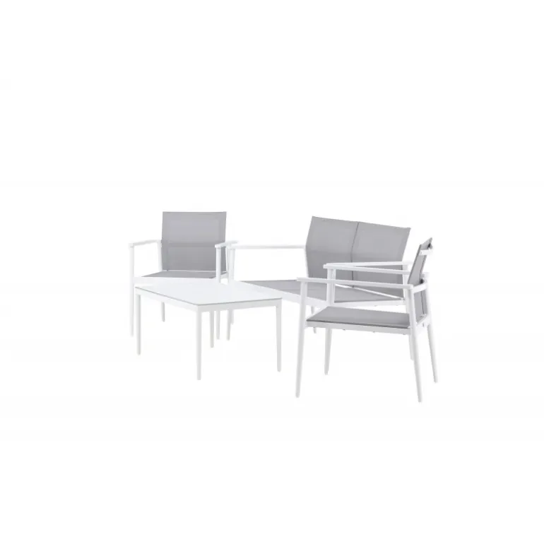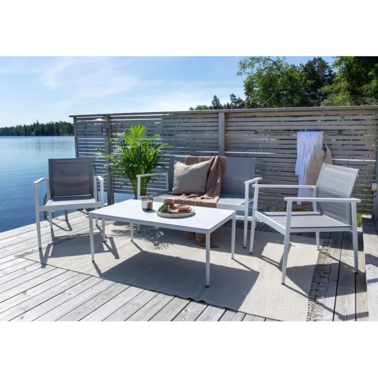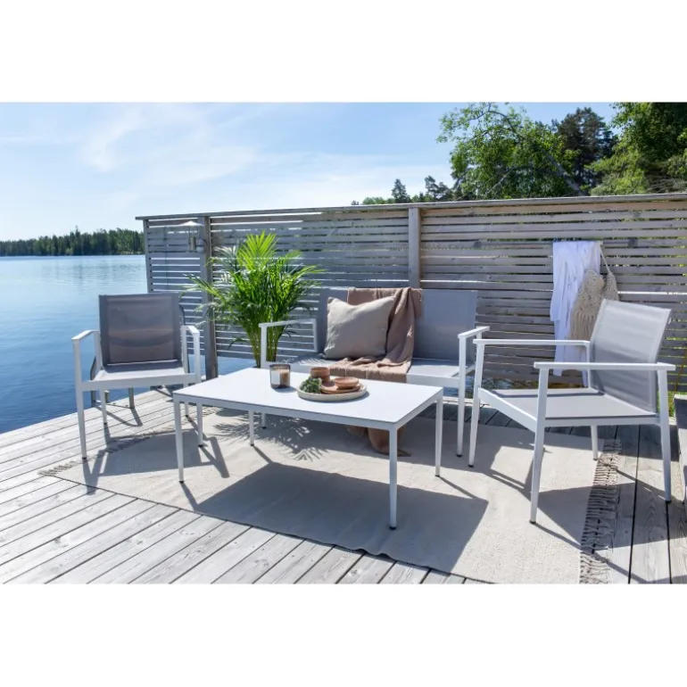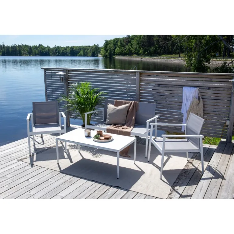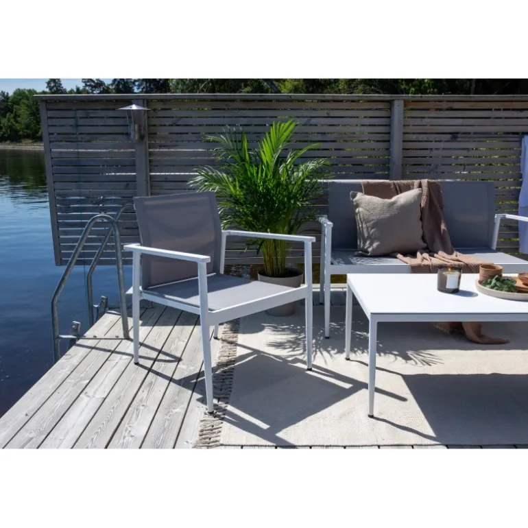 Skab dit yndlingshjørne på terrassen med et flot sofasæt fra Break-serien! Designet er gennemtænkt med fokus på komfort og stil. Den hvide ramme har en lige, nordisk form og er lavet af aluminium. Ryglæn og sæde er indbydende med høj siddekomfort lavet af grå textilene. Følg vores vedligeholdelsesråd, og du vil have et komfortabelt sofasæt at nyde med familie og venner, som holder over tid! Plejeanvisning: Vores møbler i textilene er normalt kombineret med teak eller aluminium. Textilene er et syntetisk stof lavet af PVC-behandlet polyester. Materialet er vandafvisende og UV-behandlet for at modvirke solens blegning.