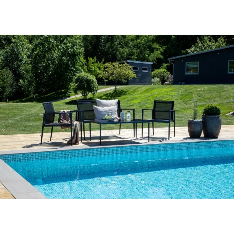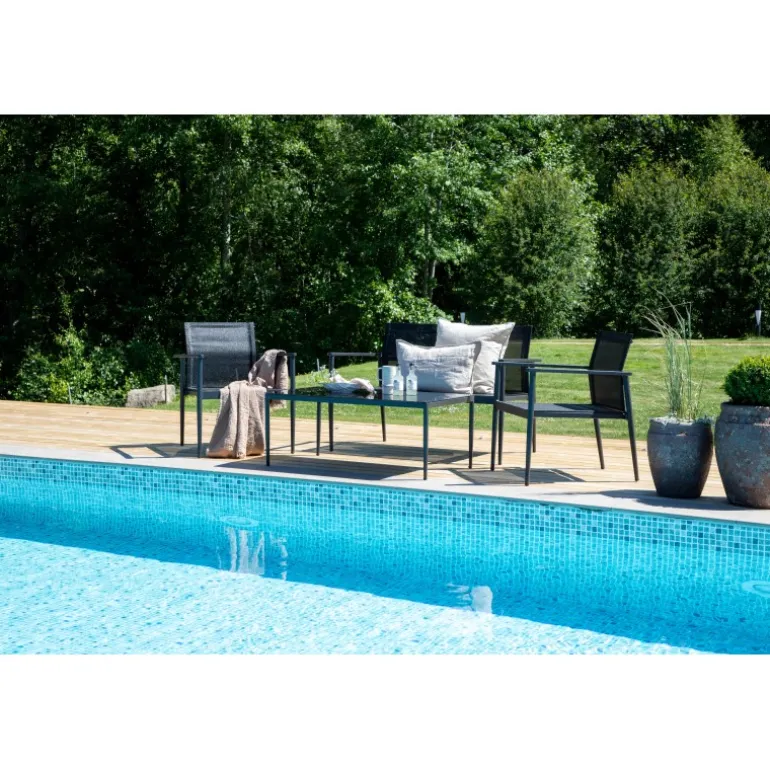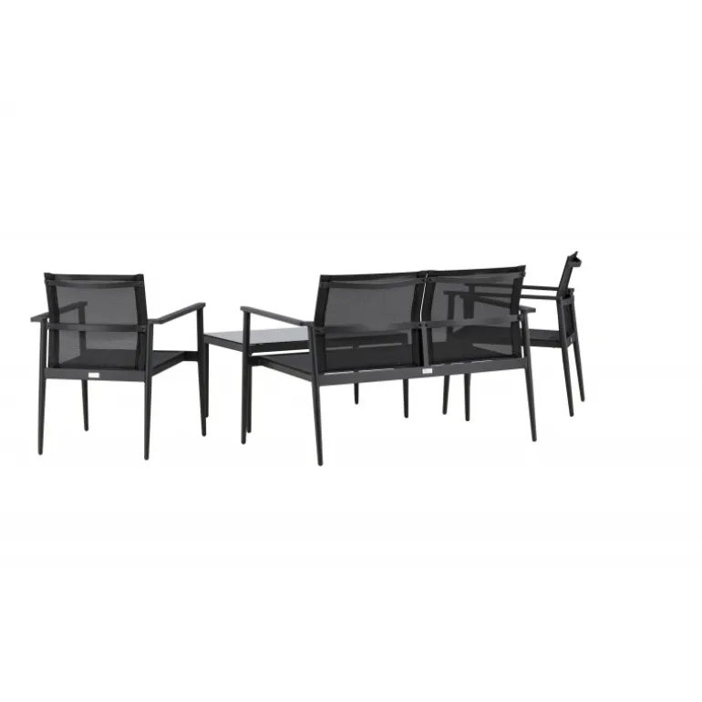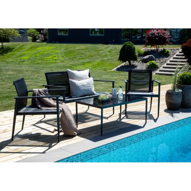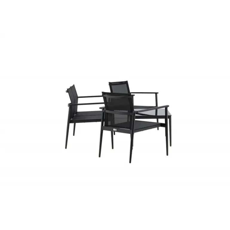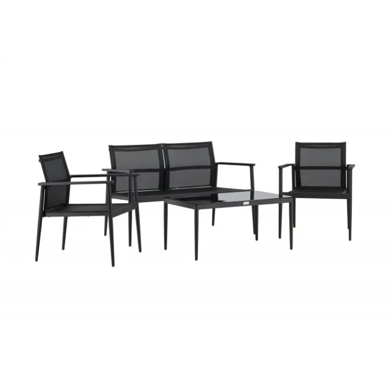 Oplev komfort og stil med Break sofa sættet, som præsenterer et luftigt design og lige nordiske former. Perfekt til altanen eller udendørsområdet denne sommer! Rammen er sort, og sæderne er lavet af textilene med en dejlig siddekomfort. Et matchende sofabord med glasplade fuldender sættet og skaber en indbydende og personlig atmosfære. Passer på dine møbler: Vores møbler i textilene kombineres ofte med teak eller aluminium. Textilene er et syntetisk stof lavet af PVC-behandlet polyester, som er vandafvisende og UV-behandlet for at modvirke solens blegning.