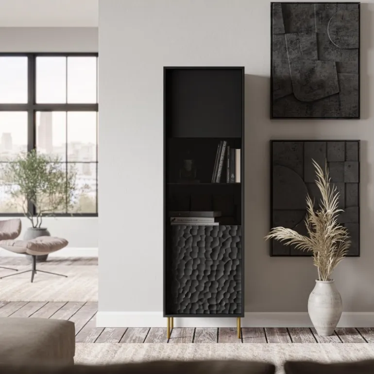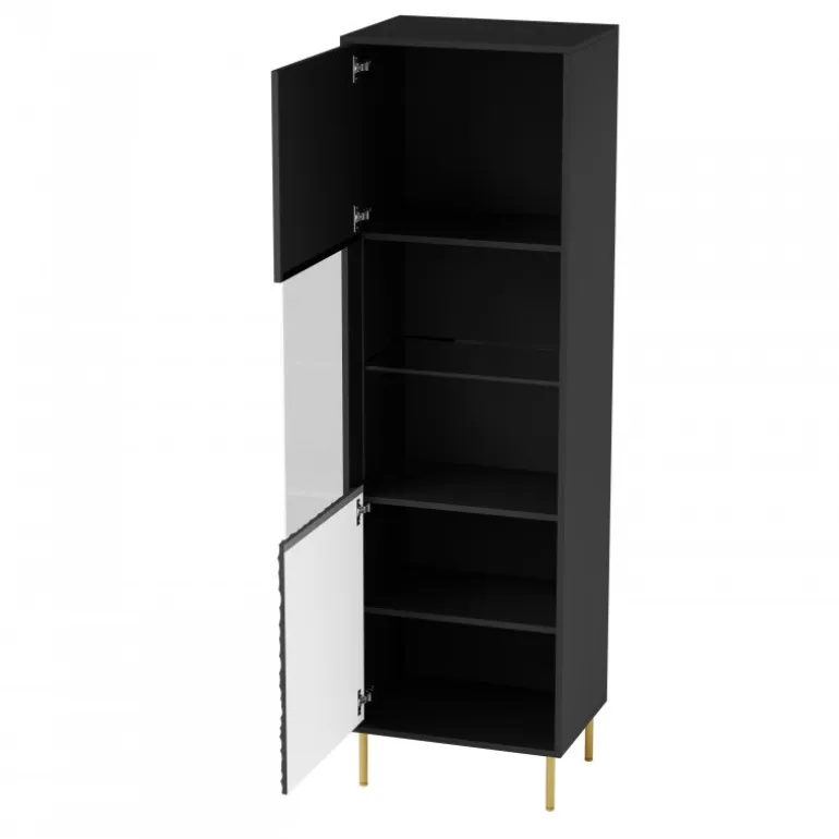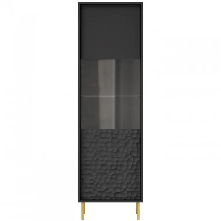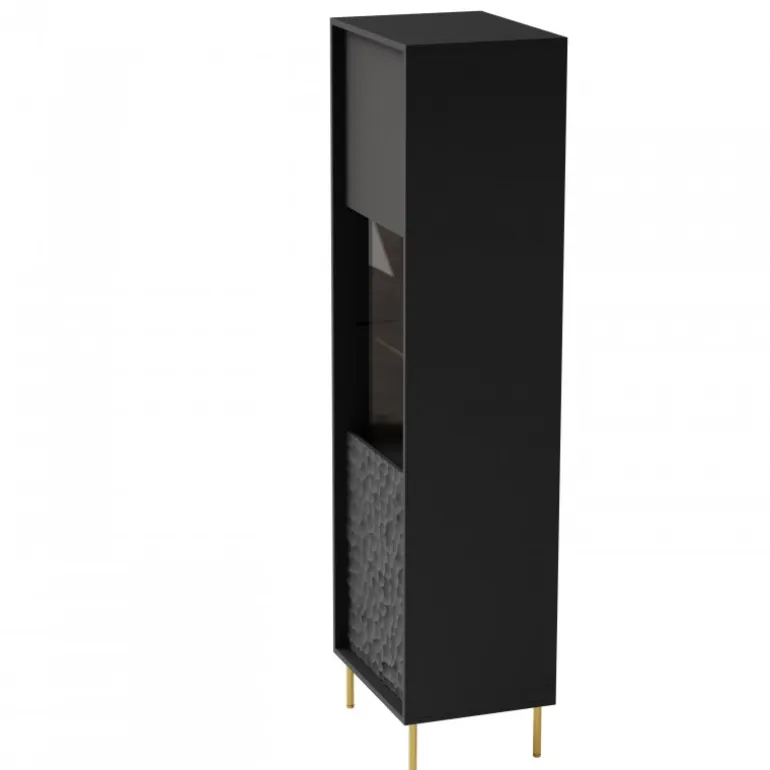 Opdag den stilfulde BULLET W-1 Vitrine, der kombinerer moderne design med funktionalitet. Denne elegante vitrine er perfekt til at fremvise dine mest dyrebare genstande og tilføje et sofistikeret touch til dit hjem. Med dimensionerne 55/41/185 cm passer den nemt ind i enhver stue eller spisestue. Materialet består af lamineret spånplade og MDF med metalben, hvilket sikrer langvarig holdbarhed og stabilitet. Farven er Sort med guld ben, hvilket skaber en luksuriøs kontrast.