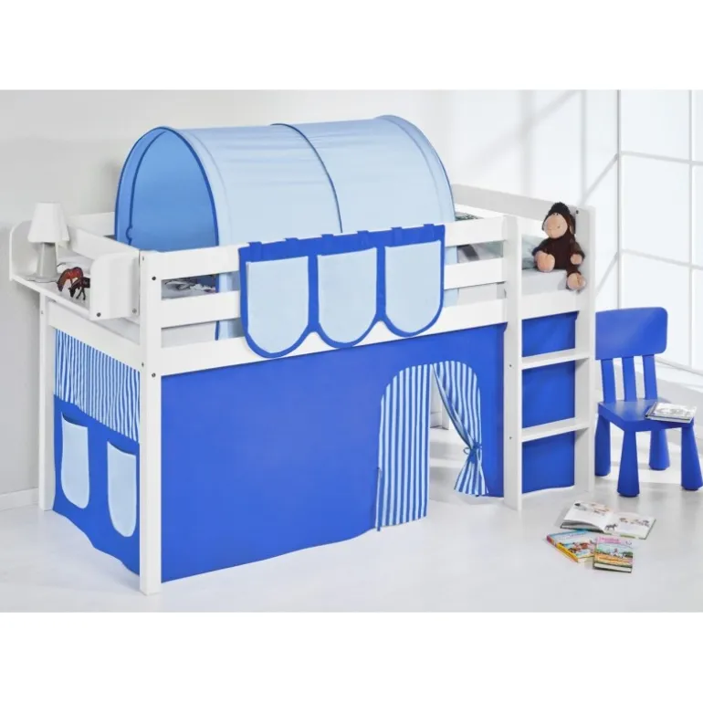 Komplet halvhøj seng fra serien Bumle inklusiv forhæng med blåt tema samt lamelbund og madras. Sengen er udstyret med flytbar stige med god brede trin, som kan monteres i enten højre eller venstre side. Bumle er serien til dig som går op i kvalitet og tidløst design men ikke vil betale for dyre mærkevarer.