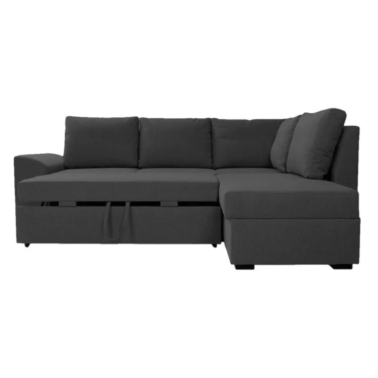 Canapé Deluxe højrevendt hjørnesovesofa med open-end og og posefjedring for optimal komfort. Denne sovesofa er yderst velegnet til dagligt brug da sofaens madrasopbygning er på højde med en god boxmadras, hvilket giver en optimal liggekomfort. Sofaen har et smart opbevaringsrum i chaiselongdelen til sengetøj og et sove udtræk på metalstel. En pladsbesparende lille hjørnesovesofa med open-end til dig som ønsker funktionalitet uden at gå på kompromis med designe og kvalitet. Canapé sofaen har løse ryghynder og en fast siddekomfort. Sofaen er betrukket et slidstærkt strukturvævet antracit møbeltekstil.
