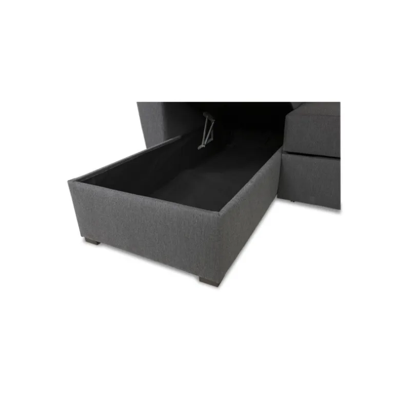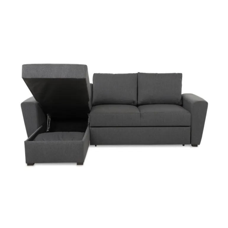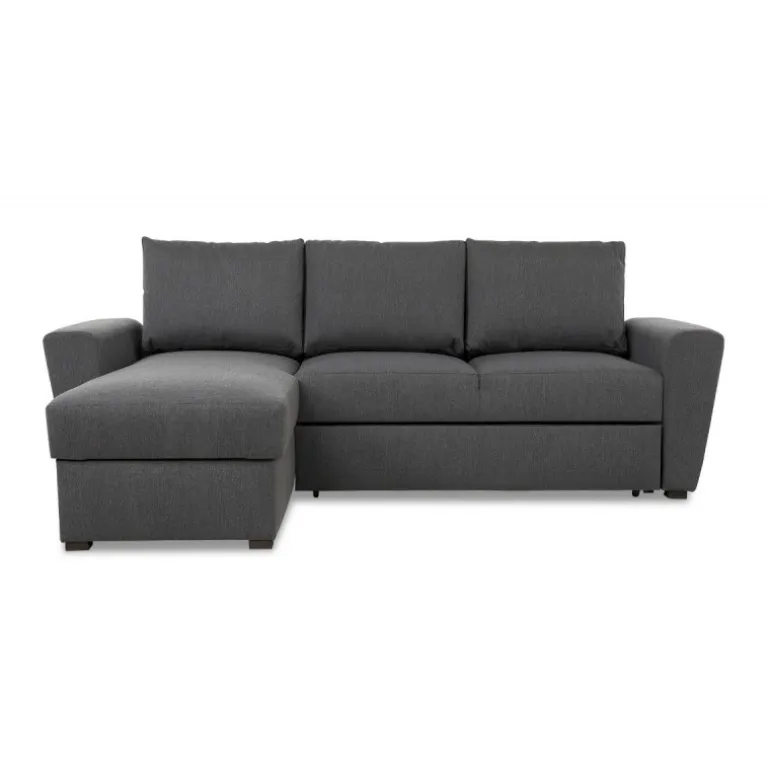 Denne sofa er udført med et rummeligt magasin i chaiselongdelen og udtræksfunktion, så du nemt og hurtigt kan omdanne sofaen til en bekvemmelig soveplads for 2 pers. Udført med skråne armlæn og i enkelt design egner sofaen sig særlig godt til mindre lejligheder hvor pladsen er trang. Studio sovesofaen har løse ryghynder og en medium/hård siddekomfort. Sofaen er betrukket med slidstærkt strukturvævet mørkegråt møbeltekstil.