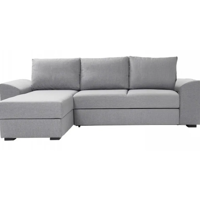 Denne sofa er udført med et rummeligt magasin i chaiselongdelen og udtræksfunktion, så du nemt og hurtigt kan omdanne sofaen til en bekvemmelig soveplads for 2 pers. Udført med skråne armlæn og i enkelt design egner sofaen sig særlig godt til mindre lejligheder hvor pladsen er trang. Studio sovesofaen har løse ryghynder og en medium/hård siddekomfort. Sofaen er betrukket med slidstærkt strukturvævet mørkegråt møbeltekstil.