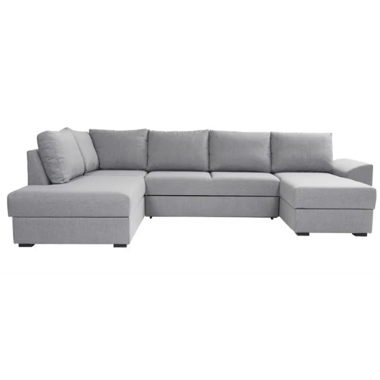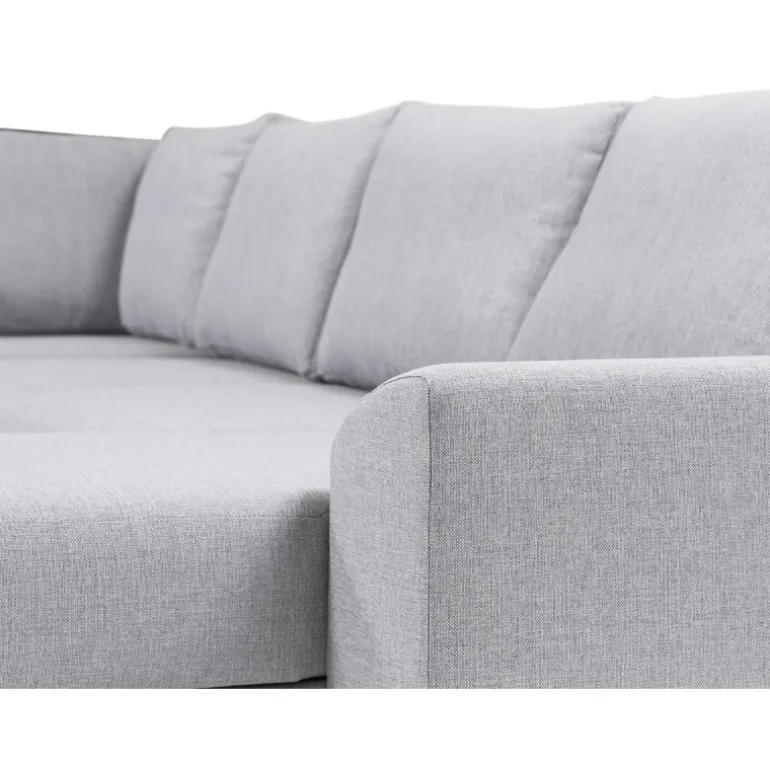 Canapé højrevendt U-sofa med sovefunktion og kæmpe magasiner i begge sider. En stor familie Sovesofa med massere plads til overnattende gæster. Canapé sofaen har løse ryghynder og en fast siddekomfort. Sofaen er betrukket et slidstærkt strukturvævet gråt møbeltekstil.