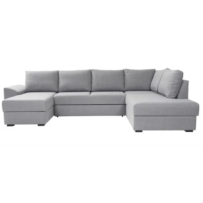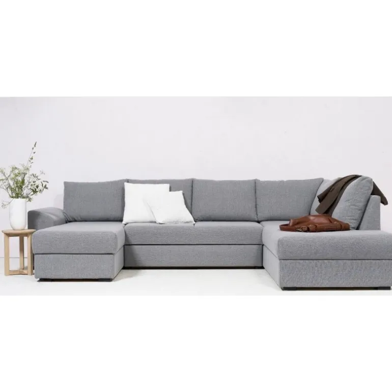 Canapé venstrevendt U-sofa med sovefunktion og kæmpe magasiner i begge sider. En kæmpe familie sofa med massere af plads til overnattende gæster. Canapé sofaen har løse ryghynder og fast siddekomfort. Sofaen er betrukket med et slidstærkt strukturvævet gråt møbeltekstil.