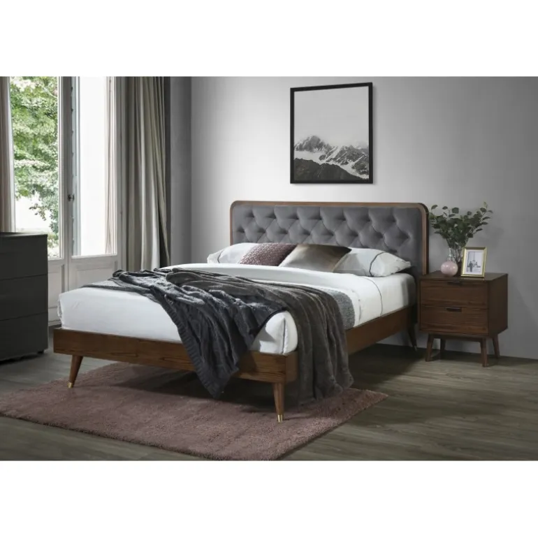 Oplev ultimativ komfort og stil med CASSIDY sengen. Fremstillet af førsteklasses materiale som stof og massivt gummitræ, denne seng kombinerer holdbarhed med en moderne æstetik. Stoffet i grå og træet i valnød farve skaber en elegant og tidløs look, perfekt til ethvert soveværelse. Bemærk venligst, at sengen leveres uden madras, men en valgfri POLARIS 160x200cm madras kan tilkøbes.