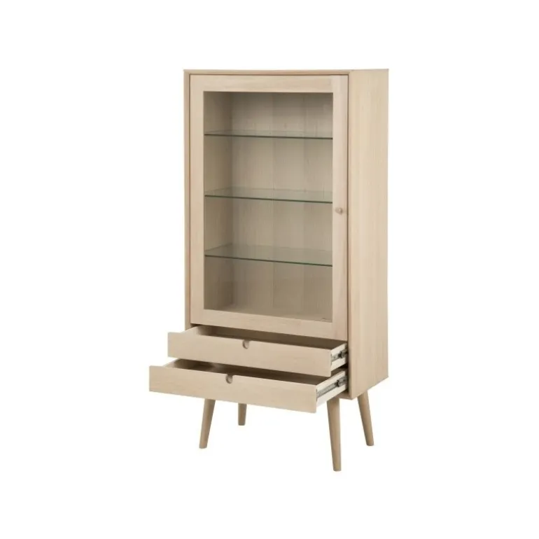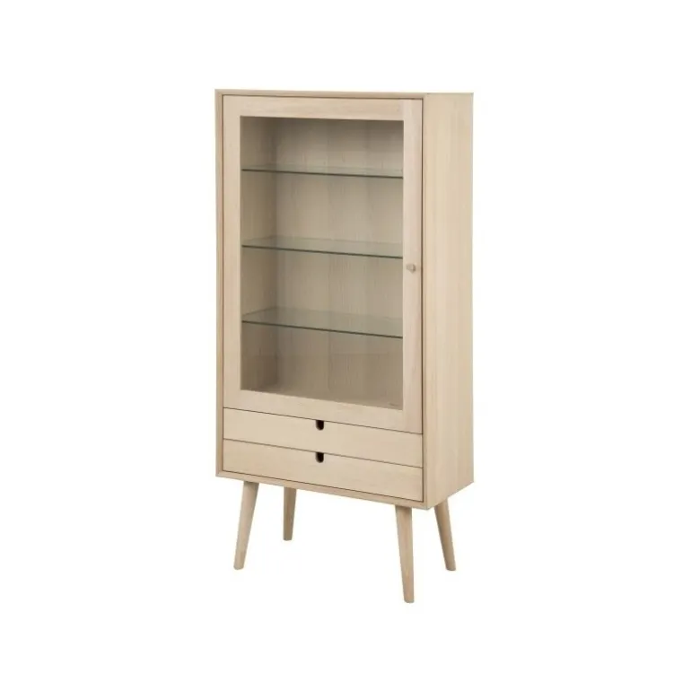 Stilrent vitrineskab med 1 glaslåge og 2 skuffer. Vitrinen rammen er udført i massivt egetræ, der er behandlet med hvidpigmenteret olie, hvilket giver træet en lys og lækker finish. Skufferne har fine minimalistiske udskæringer, som understøtter det enkle og tidløse udtryk og lavet af MDF.