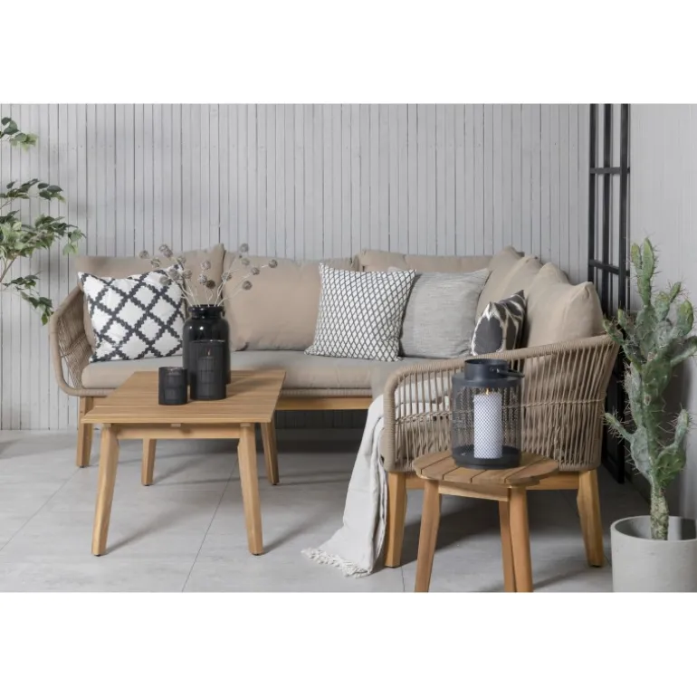 Chania Samtalesæt er en flot og stilfuld gruppe lavet af smukt akacietræ, lattefarvet/brunt stål og fletreb i en naturlig farve. Det medfølgende bord er ensartet i akacietræ, hvilket skaber en flot helhed. Sættet inkluderer holdbare puder i beige og kan rumme i alt 5 siddende gæster. Bordmål: 110x60x45 cm. Sofamål: 213x75x76 cm. Siddemål: 186x65x33 cm. Inviter til mange hyggelige stunder denne sommer! Plejeråd: For at dine udendørsmøbler i akacietræ/hårdttræ skal bevare deres finish, bør de behandles med olie. Da træet i sig selv ikke er særlig fedtholdigt af natur, skal det olieres lidt nu og da, også i løbet af sæsonen. Nyindkøbte møbler bør mættes med olie; påfør flere lag i træk, så træet optager mest muligt olie.
