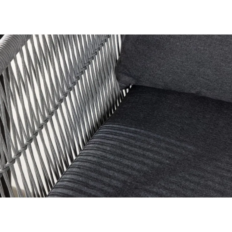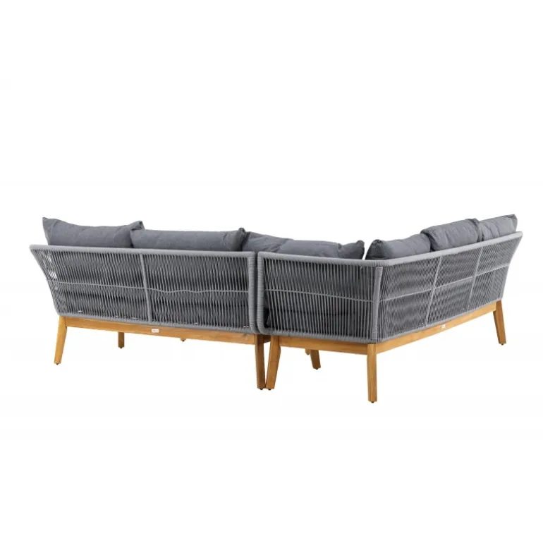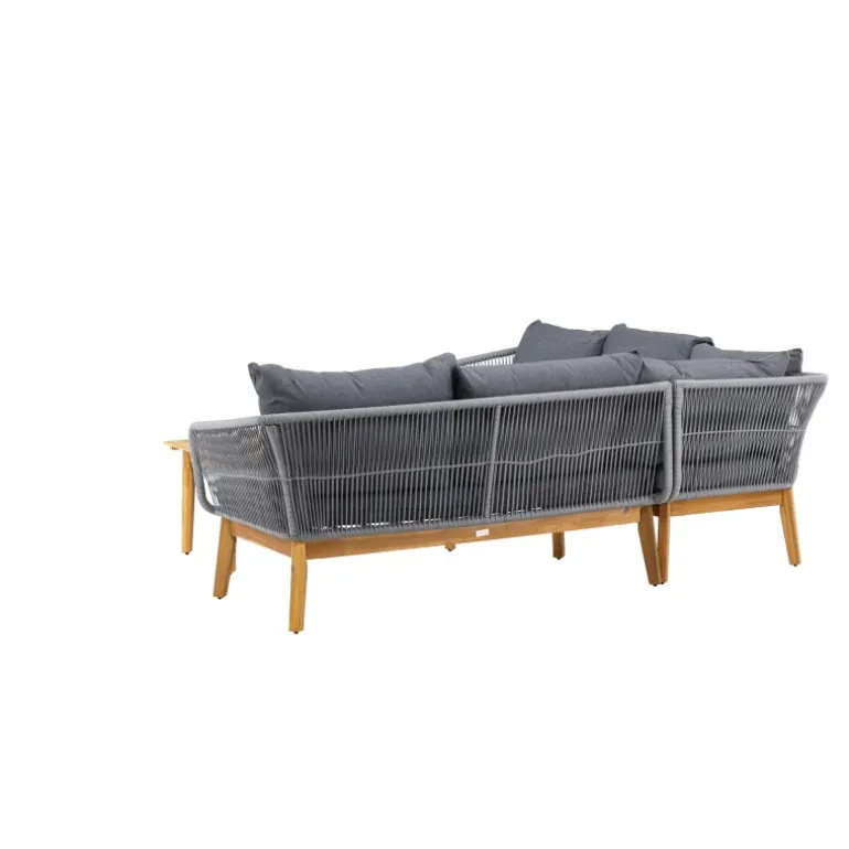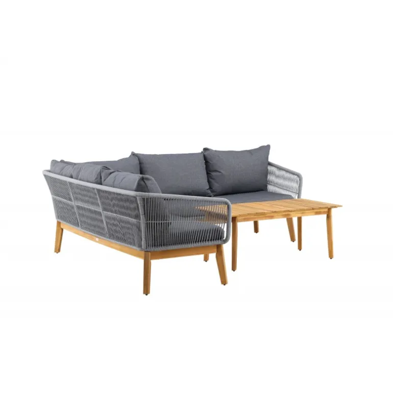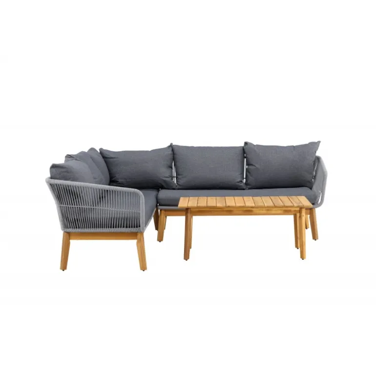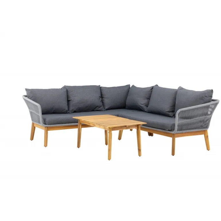 Chania – en trendy, moderne sofasæt, der fokuserer på bekvemmelighed. Sofasættet består af en hjørnesofa med fire sæder og en hjørnedel, inklusive tykke, holdbare mørkegrå hynder. Sættet inkluderer også et lavt sofabord lavet helt i akacietræ. Sofaen er designet med en ramme i aluminium med akacieben, og ryggen og siderne er flettet i en lys grå reb, hvilket giver et stilfuldt design. Hjørnet af hjørnesofaen og sofabordet i akacietræ skaber en eksklusiv følelse.