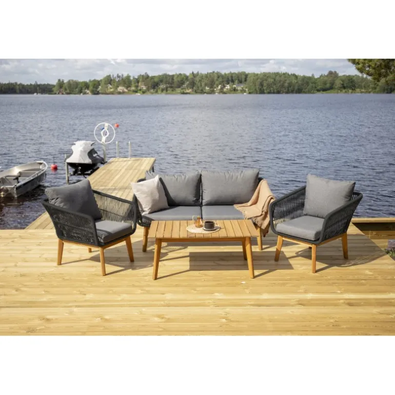 Chania – Et trendy sofasæt med fokus på komfort og iøjnefaldende design. Sofasættet består af en to-personers sofa, to ramme lænestole inklusiv tykke, holdbare mørkegrå hynder. Sættet inkluderer også et lavt kaffebord, konsekvent lavet af smuk akacietræ. Sofasættet er lavet med en ramme i aluminium og ben i akacietræ, og ryggen og siderne er flettet i sort reb, hvilket giver et luksuriøst design. Sofasættets detaljer i akacietræ sammen med kaffebordet skaber en eksklusiv følelse. Vedligeholdelsesråd: Vores reb er kvalitets-spundet polyesterreb, der er let at rengøre. Møblerne er behandlet til at modstå 500-2000 timers sol. Vi anbefaler sæbe og vand til rengøring. Lad det lufttørre.