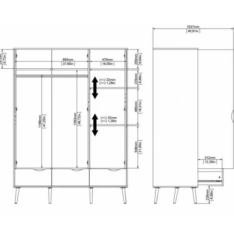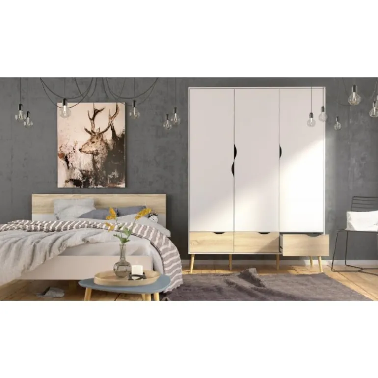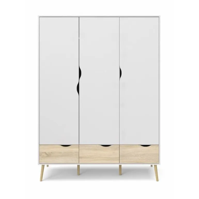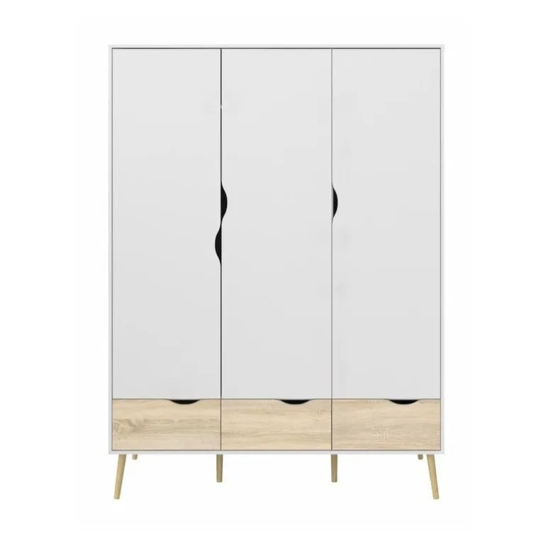 Smart hvidt 3-lågers klædeskab i lækker nordisk retrostil. En funktionel og flot løsning med 3 grebsfri låger, 3 eg struktur skuffer samt 1 bøjlestang og 1 fast hylde indvændig. Skabet er monteret på skrå ben i massivt egetræ.