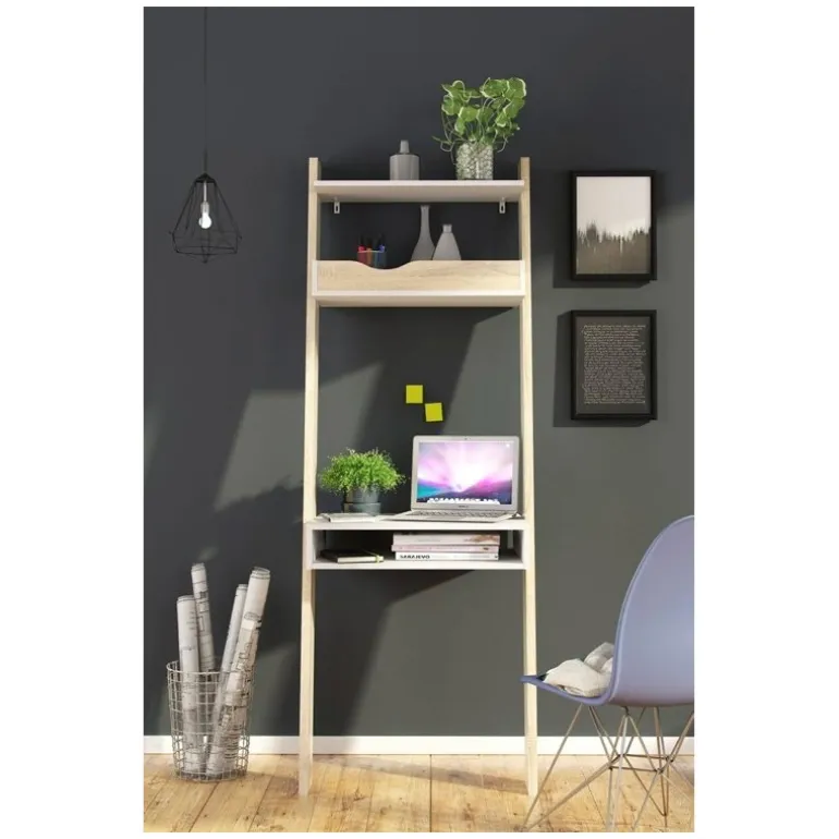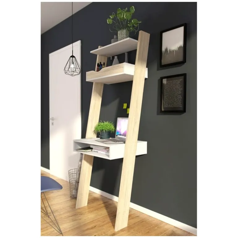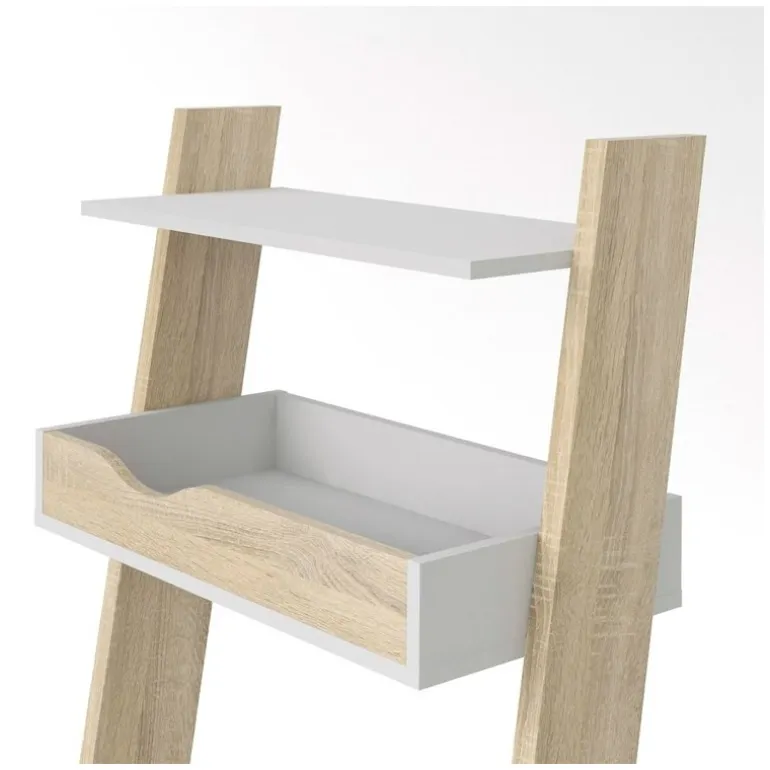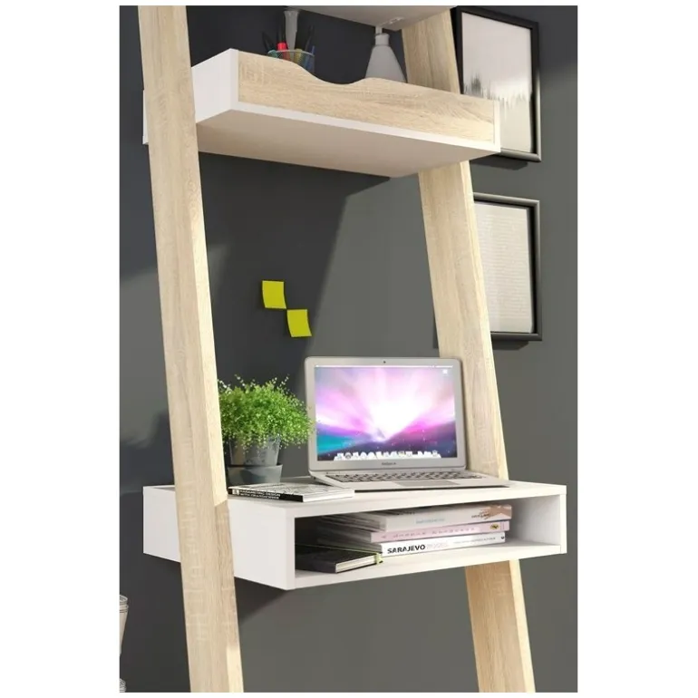 Charlie skrivebordsreol i nordisk retro stil udført i flot eg strukturmelamin kombineret med hylder i mat hvid. Reolen forener behovet for design og funktionalitet, så du roligt kan have arbejdsstationen synligt placeret i stuen, alrummet eller på værelset. Reolen er udstyret med 1 tophylde, 1 notatbakkehylde samt skrivebordsplade med mulighed for opbevaring af eksempelvis bærbar computer.