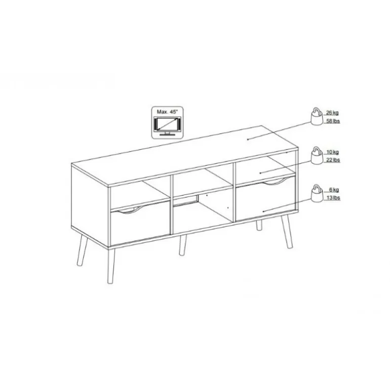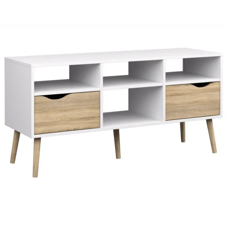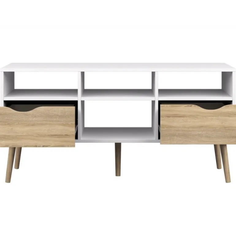 Rummeligt hvidt tv-bord med 2 skuffer i eg struktur og skrå ben i lyst træ. Dette flotte tv-bord er inddelt i 6 rum, så der er god plads til opbevaring af tv-enheder, fladskærm m.m. Kombinationen af hvid og eg struktur giver tv-bordet et elegant nordisk look, der pynter i enhver bolig.