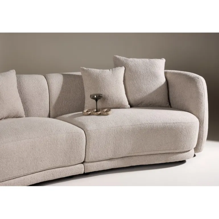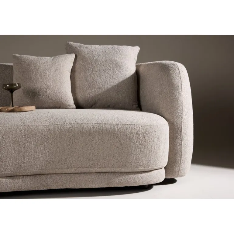 Det bløde bouclémateriale tilfører en elegant tekstur og varme, som smelter smukt ind i både skandinaviske og moderne indretninger. Sofaens runde former, generøse sædepuder og behagelige ryglæn inviterer til både afslapning og hyggelige stunder med familie eller gæster.
