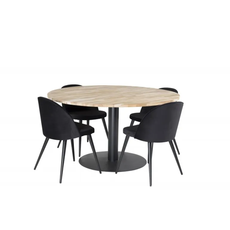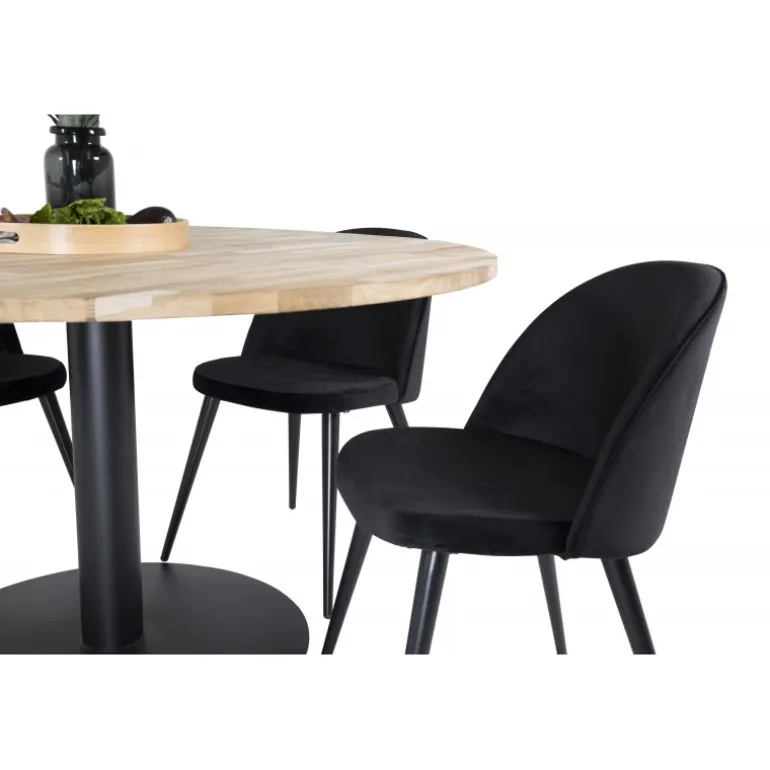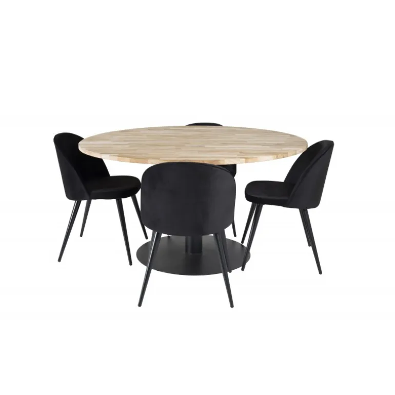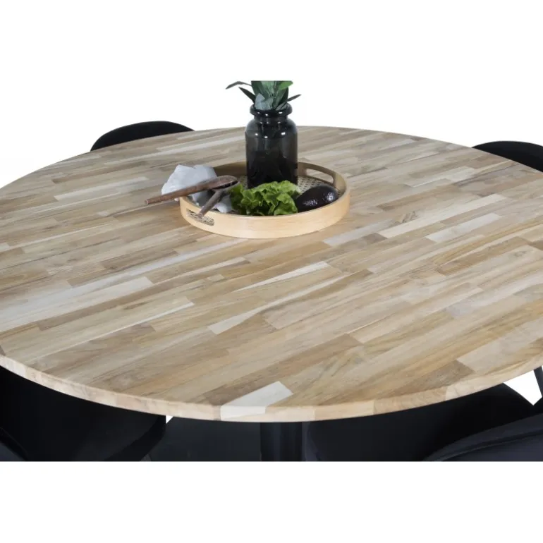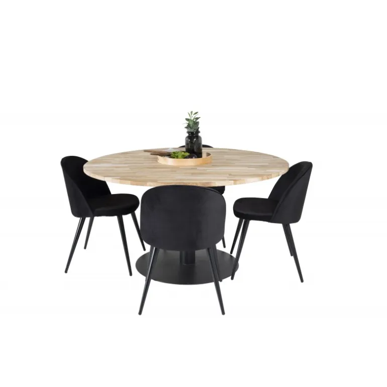 Cirebon, et moderne og pænt Spisebordssæt, der inkluderer en spisebord og stole fra Velvet-serien. Skab en elegant og social atmosfære med plads til god mad og hygge. Dette sæt kombinerer stil og funktionalitet, hvilket gør det ideelt til enhver spisestue. Bordpladen er lavet af teaktræ, der tilføjer et naturligt og varmt udseende, mens stolene er designet med bøgetræ, skum og stål for maksimal komfort og holdbarhed.