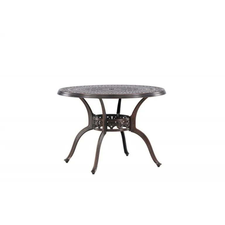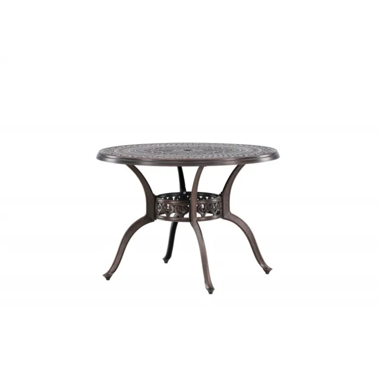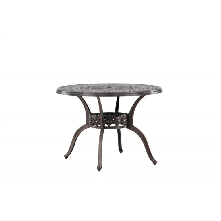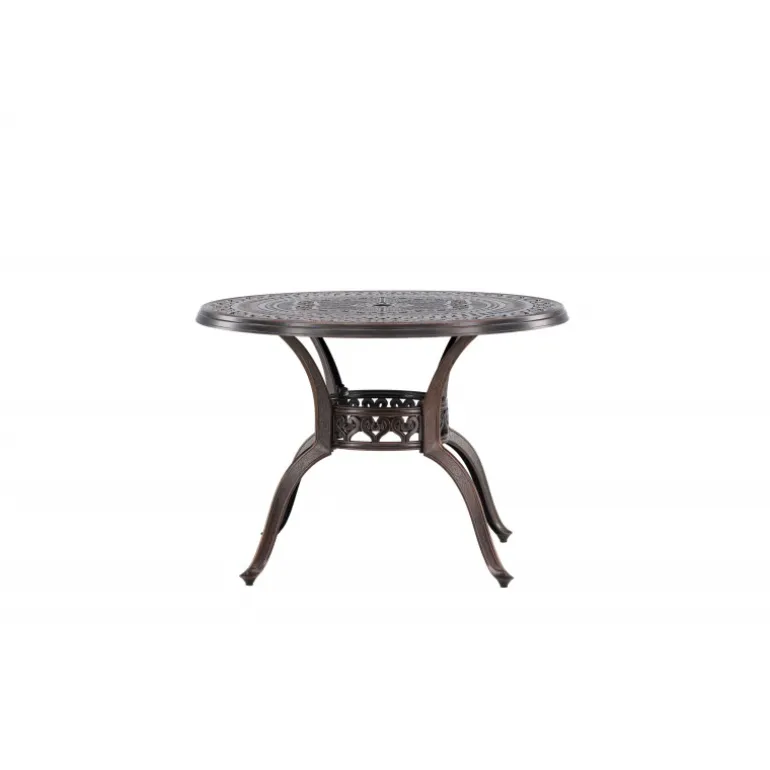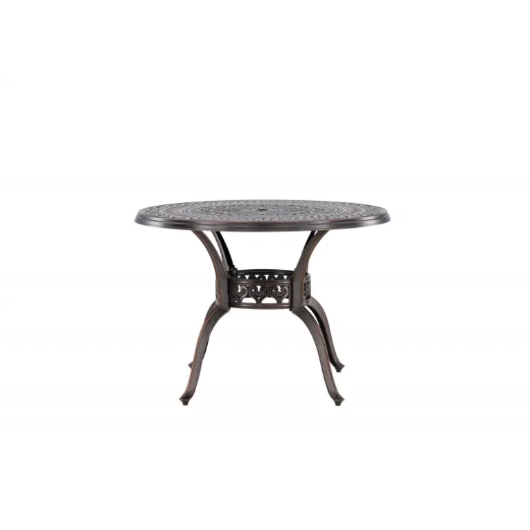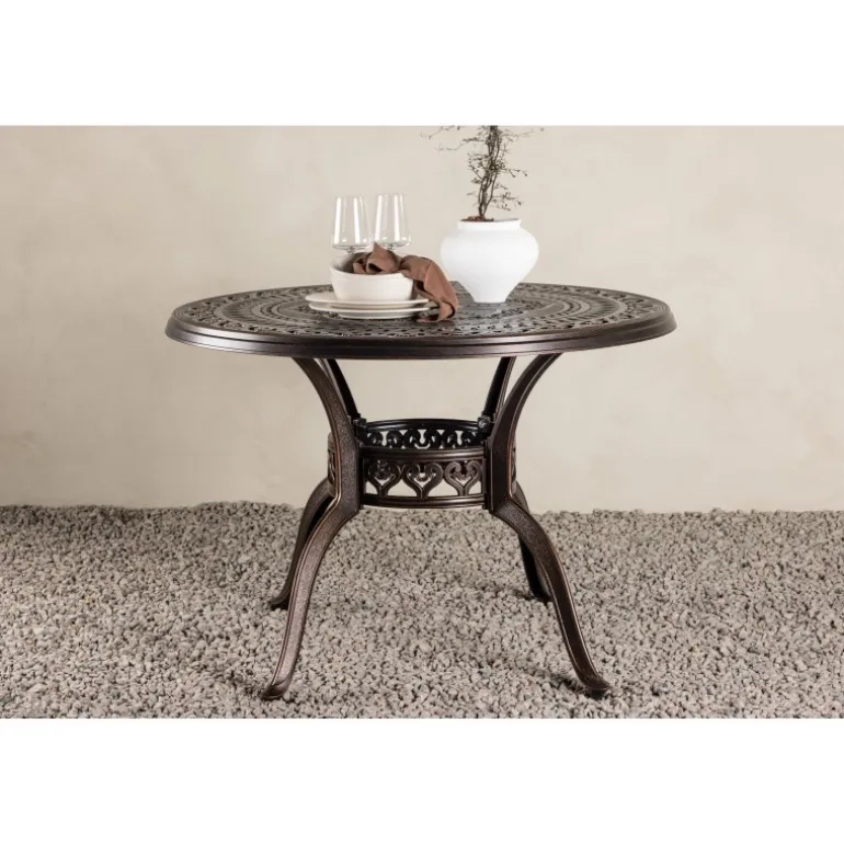 Leder du efter et stilfuldt bord med plads til to i din boligindretning? Så er Coimbra det perfekte valg for dig. Med en diameter på 100 cm tilbyder dette bord masser af plads til to personer til at nyde et dejligt måltid eller en behagelig samtale. Coimbra er lavet af holdbart aluminium og kommer i en smuk brun nuance, der tilføjer et strejf af elegance til dit hjem. Den mønstrede bordplade har en unik struktur, der ikke kun giver bordet en moderne æstetik, men også et behageligt element, der gør det til et fokuspunkt i dit rum. Dets rene og stilfulde design, kombineret med kvalitetsmaterialer, gør det til et bord, der vil være en del af din indretning i lang tid fremover. Lad Coimbra være midtpunktet i din have eller på din balkon, og nyd dets elegance og kvalitet dag efter dag.