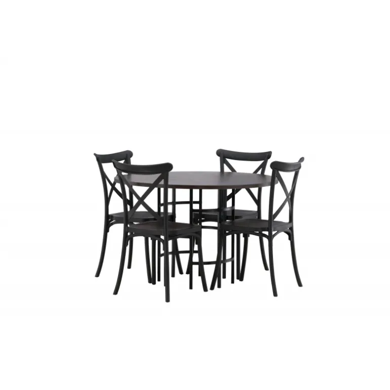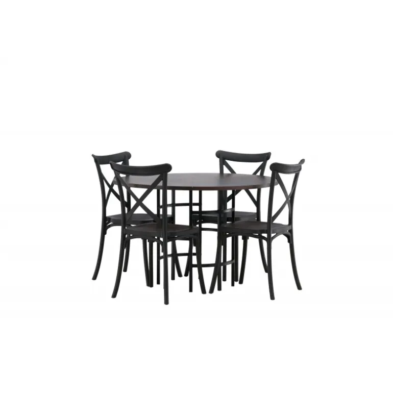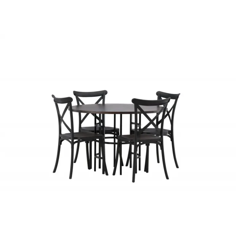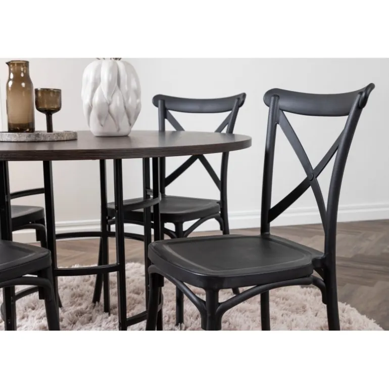En spisestuegruppe, der kombinerer klassisk design og moderne former! Det runde spisebord fra Copenhagen-serien tilhører Furniture Fashion-kollektionen og har en smuk brunfarvet bordplade i MDF med finer og en dekorativ, cylinderformet base i sort metal. Sammen med spisebordsstole fra Crosett-serien får du her en stilfuld Spisebordssæt til at dekorere dit hjem med. Stolene har et nostalgisk design med krydsryg og lige linjer, lavet i sort plast.