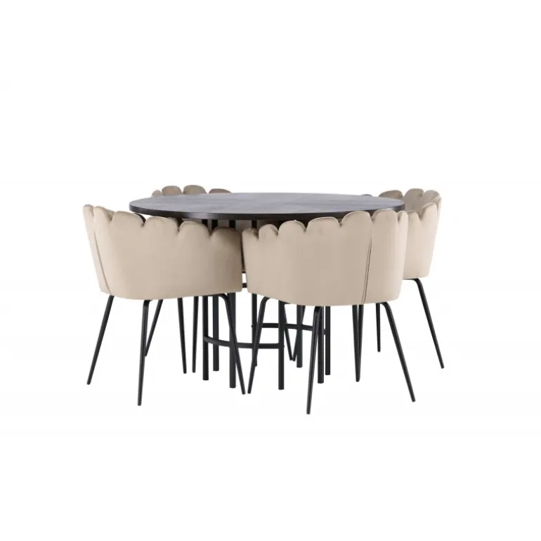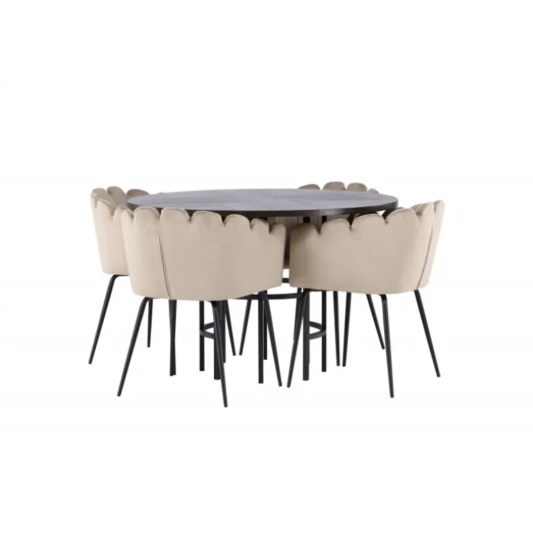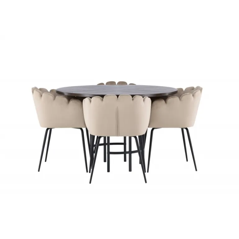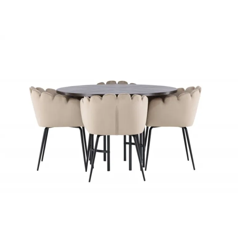Skab en luksuriøs blikfang! Vores runde spisebord Copenhagen har en smuk brun bordplade i MDF med finer og en dekorativ, cylinderformet base i sort metal. Sammen med vores populære Limhamn spisebordsstole. Stolen har et indbydende design med dekorativ skalformet ryg med dekorative syninger og et rundt sæde i smagfuldt beige velourstof. Benene er i sort pulverlakeret metal. Sid komfortabelt og elegant fremadrettet! Bordets dimensioner: 115 cm.
