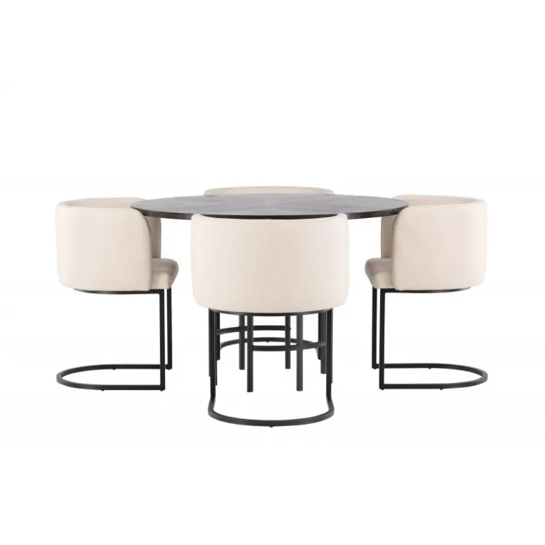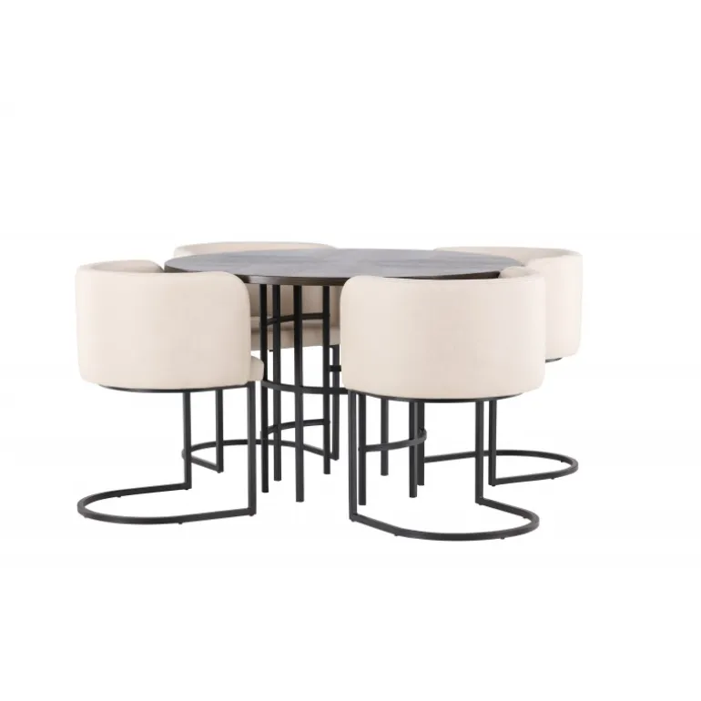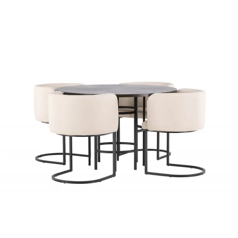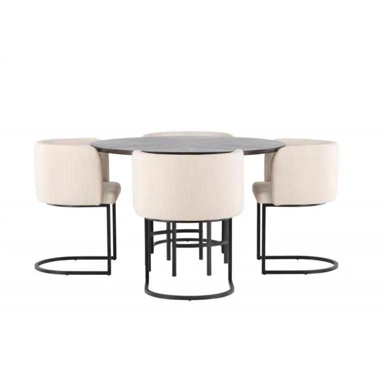 Møbler dit hjem luksuriøst og storslået! Vores runde spisebord Copenhagen har en smuk brun bordplade i MDF med finer og en dekorativ, cylinderformet base i sort metal. Her sammen med vores elegante spisebordsstole fra Simrishamn-serien. Stolen har et fuldt polstret sæde med en rund ryglæn i beige TC-stof og dekorative, minimalistiske ben i sort stål. Sid komfortabelt og nyd måltider med dine kære! Borddimensioner: 115 cm.