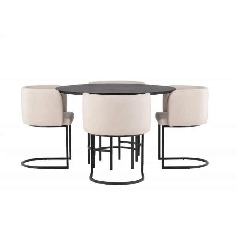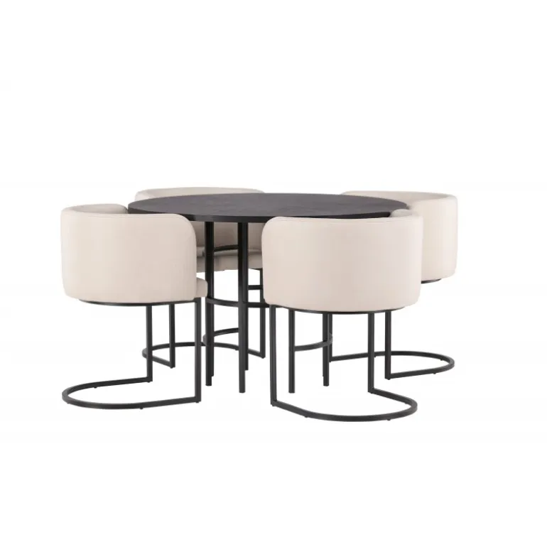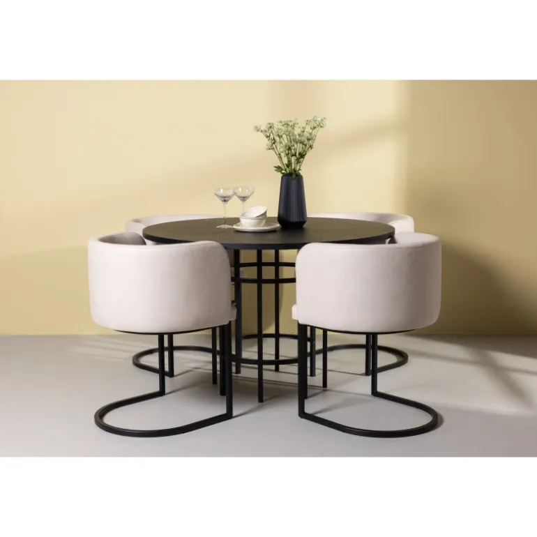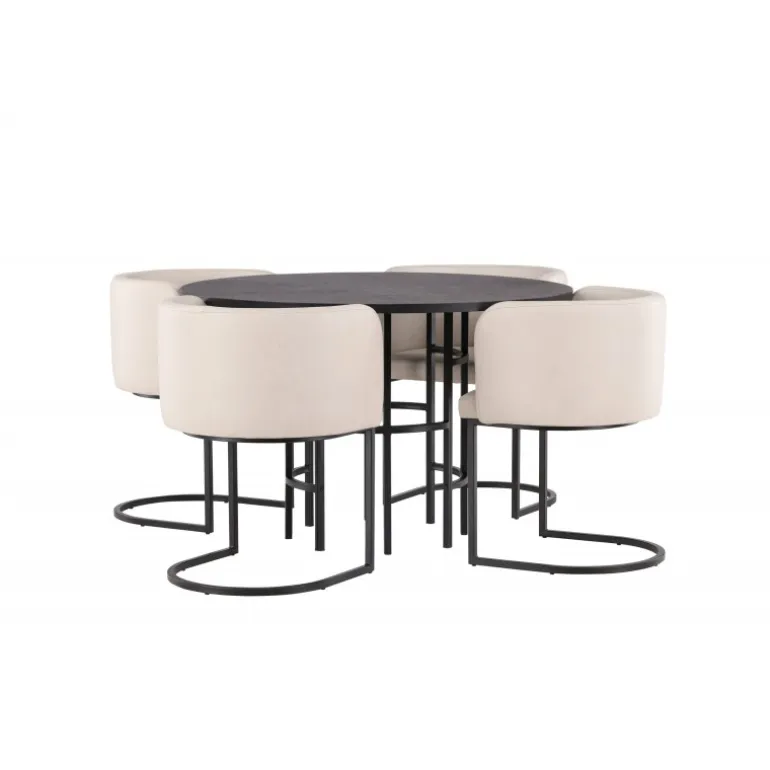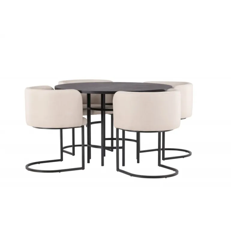 Det skal føles festligt at sætte sig ned til et lækkert måltid! Vores runde spisebord Copenhagen har en elegant, sort MDF bordplade og en dekorativ, cylinderformet base i sort metal. Her sammen med vores elegante spisebordsstole fra Simrishamn-serien. Stolen har et fuldt polstret sæde med en rundet ryglæn i beige TC stof og dekorative, minimalistiske ben i sort stål. Dette Spisebordssæt imponerer med sin luksuriøse karisma! Bordets dimensioner: 115 cm.