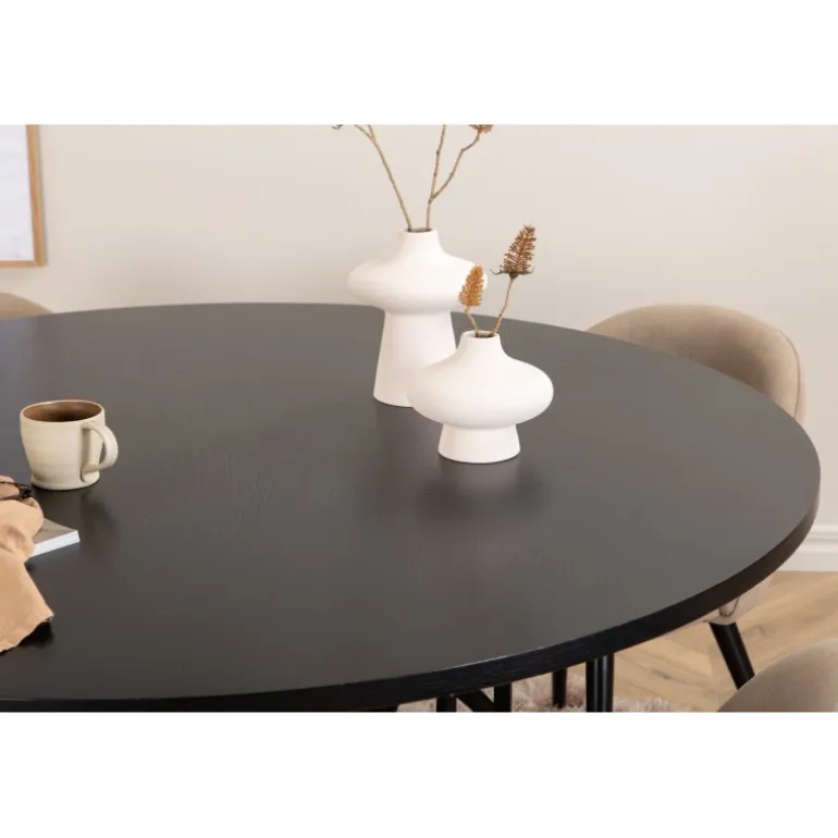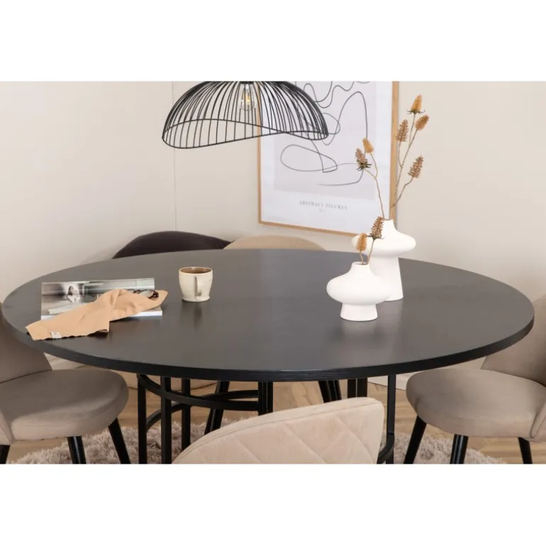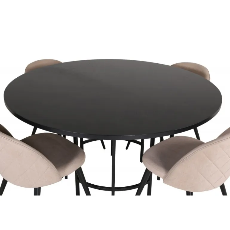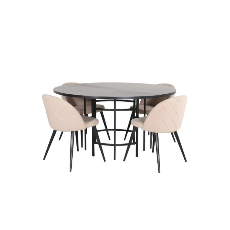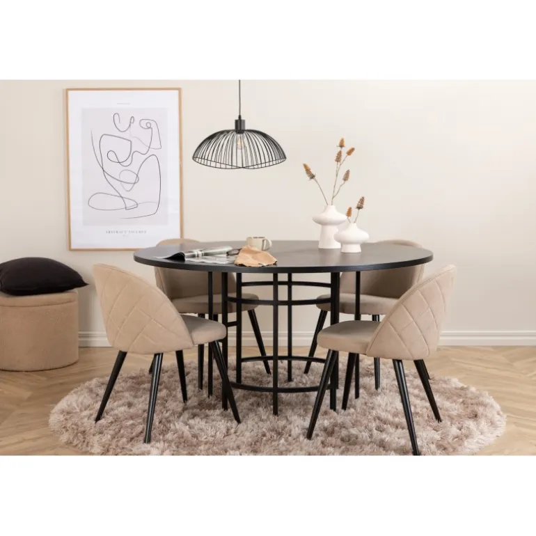 Gør din stue indbydende og tidløs med Copenhagen rundt Spisebordssæt! Copenhagen spisebord har et tidløst design i konsekvent sort farve med en bordplade i MDF med finer og et dekorativt, cylinderformet metalunderstel. Bordets diameter: 140 cm, højde: 74 cm. Her i en lækker kombination med 4 Velvet Stitches spisebordsstole. Stolens ben er let udsvinget i jern, og sæderne er betrukket med beige polyesterlinned med stilfulde dekorative stikninger. Stolens dimensioner: Højde: 76,5 cm, sædehøjde: 46,5 cm, bredde: 50 cm, dybde: 57 cm. Lige så godt for øjet som behageligt at sidde på!