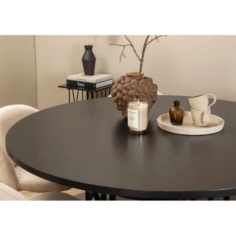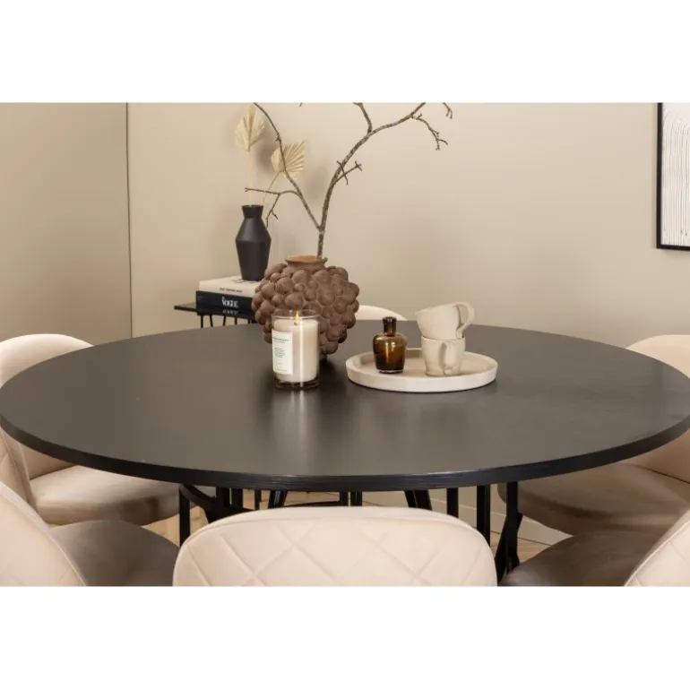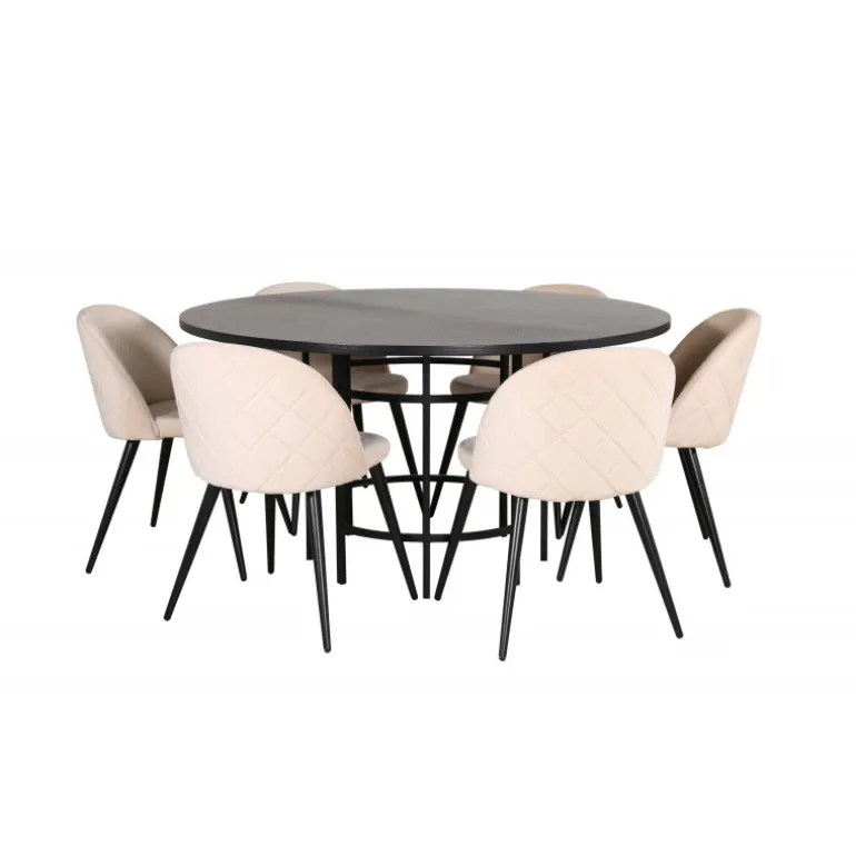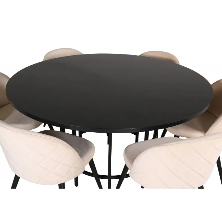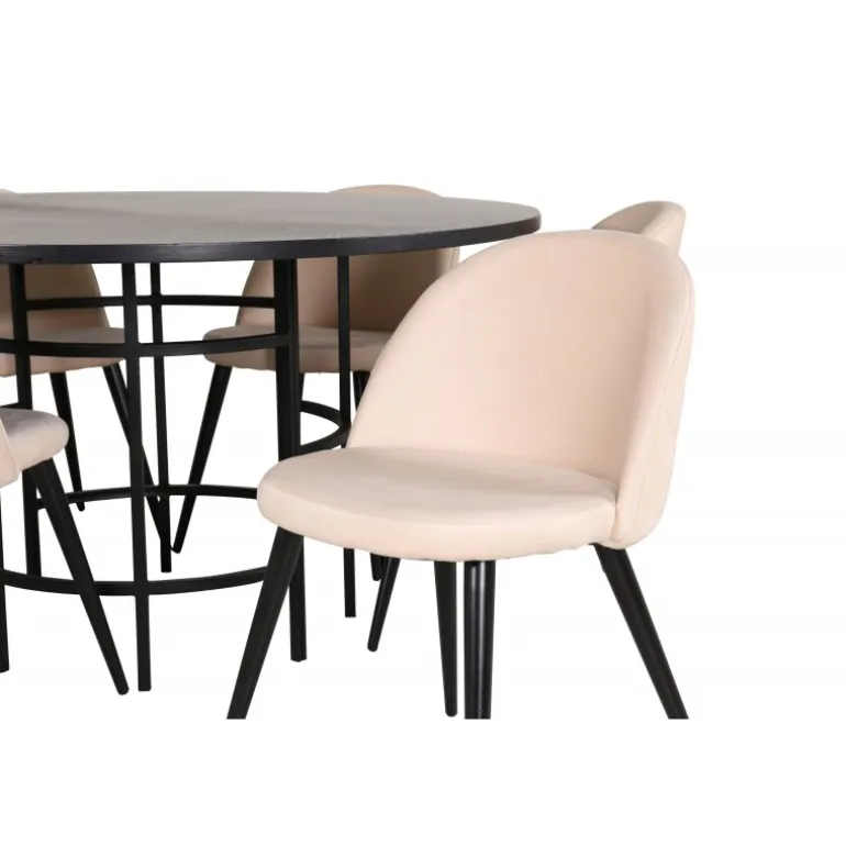 Inviterende, bekvemt og iøjnefaldende! Copenhagen Rundt Spisebordssæt har et tidløst design i gennemgående sort farve med en bordplade i MDF med finer og en dekorativ, cylindrisk formet metalunderdel. Bord Diameter: Diameter: 140cm, Højde: 74cm. Her i lækker kombination med 6 Velvet Stitches spisestole. Stolens ben er let flarede i jern, og sæderne er i beige velourstof med stilfuldt dekorativt syning. Stoledimensioner: Højde: 76,5cm, sædehøjde: 46,5cm, bredde: 50cm, dybde: 57cm. Indret stuen hjemligt og moderne!
