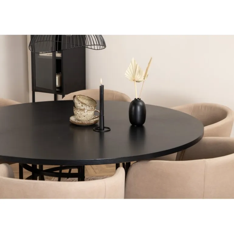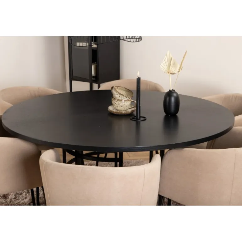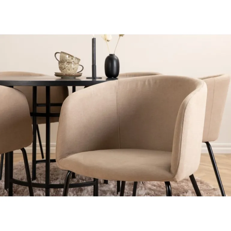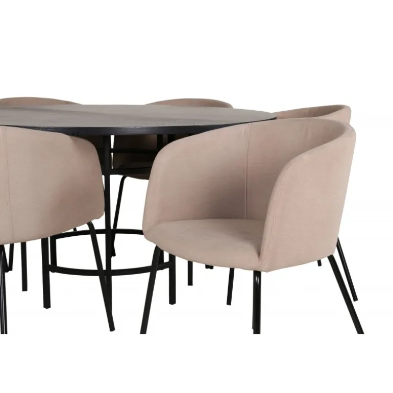 Skab et charmerende midtpunkt i hjertet af hjemmet med et rundt Spisebordssæt i moderne look! Copenhagen spisebord har et trend-sikkert design i konsekvent sort farve med en bordplade i MDF med finer og et dekorativt, cylinderformet metalunderstel. Bordets diameter: 140 cm, Højde: 74 cm. Her er det matchet med 6 Berit spisebordsstole i luksuriøst design. Stolene har en behagelig sæde i beige polyester linned og stilfuldt smalle stoleben i jern. Stolens dimensioner: Højde: 78 cm, Sædehøjde: 49 cm, Bredde: 55 cm, Dybde: 55 cm. Indret til en hyggelig middagstid!