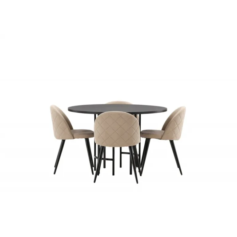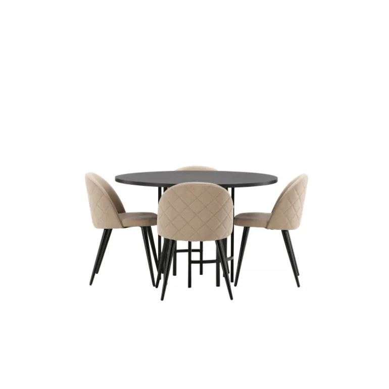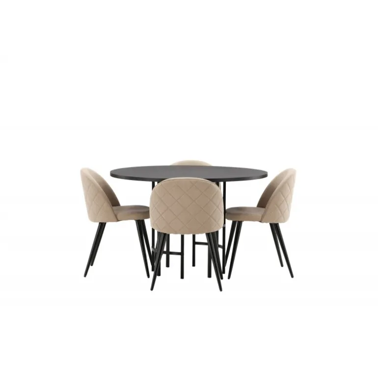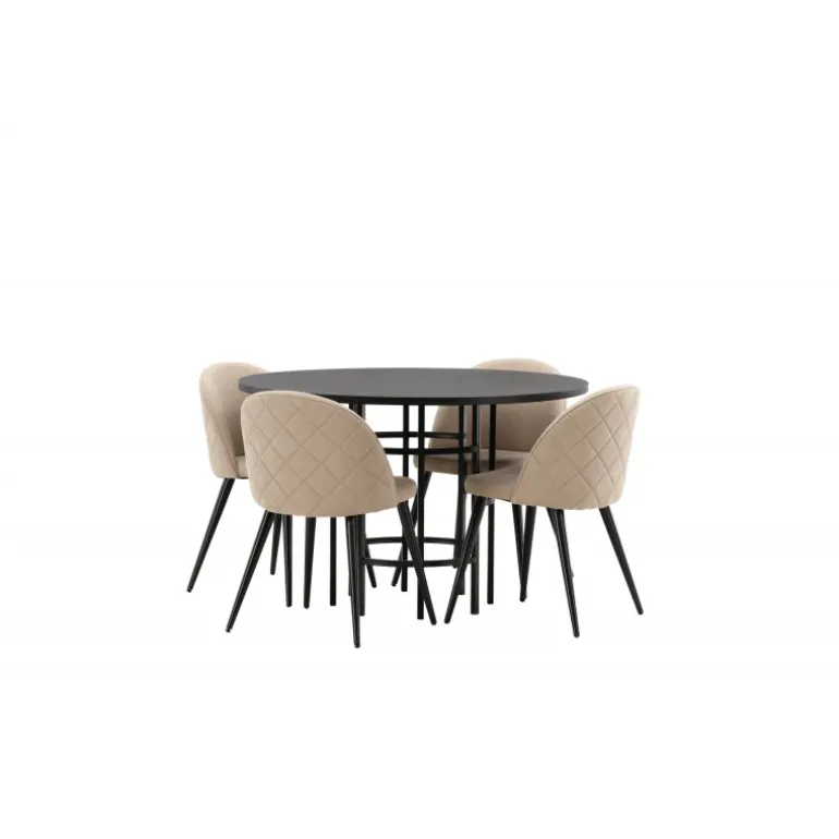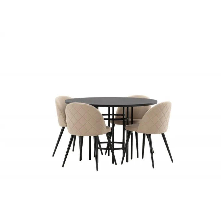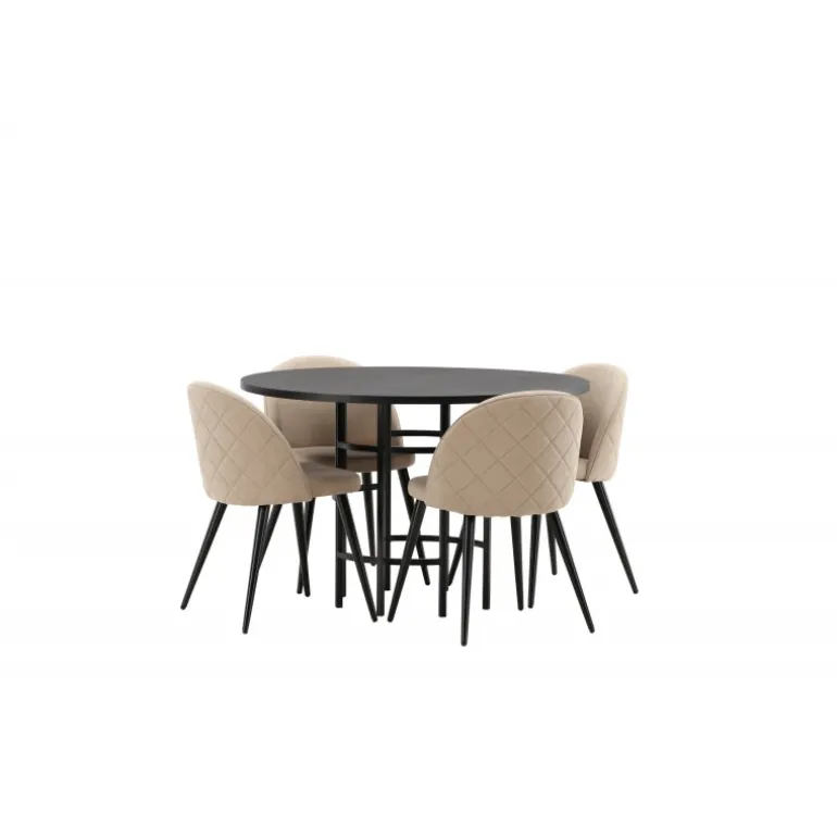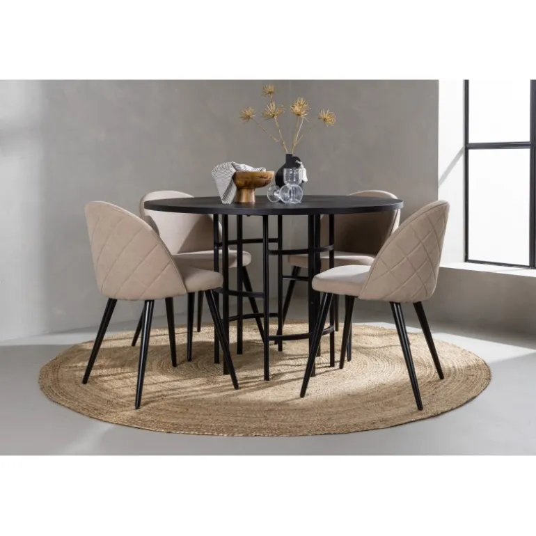 En komfortabel Spisebordssæt, der står tidens prøve! Dette trend-sikre spisebord fra Copenhagen-serien tilhører Furniture Fashion-kollektionen og har en sodsort bordplade i MDF med finer og en dekorativ, cylindrisk base i sort metal. Sammen med en moderne stol fra Velvet Stitches-serien i en varm beige farve. Denne spisebordsstol har et fuldt polstret design med en let buet ryg og sæde i blødt polyesterstof og ben i sort pulverlakeret metal. Skab et charmerende midtpunkt at samle familien omkring!