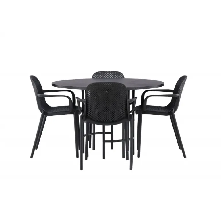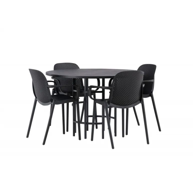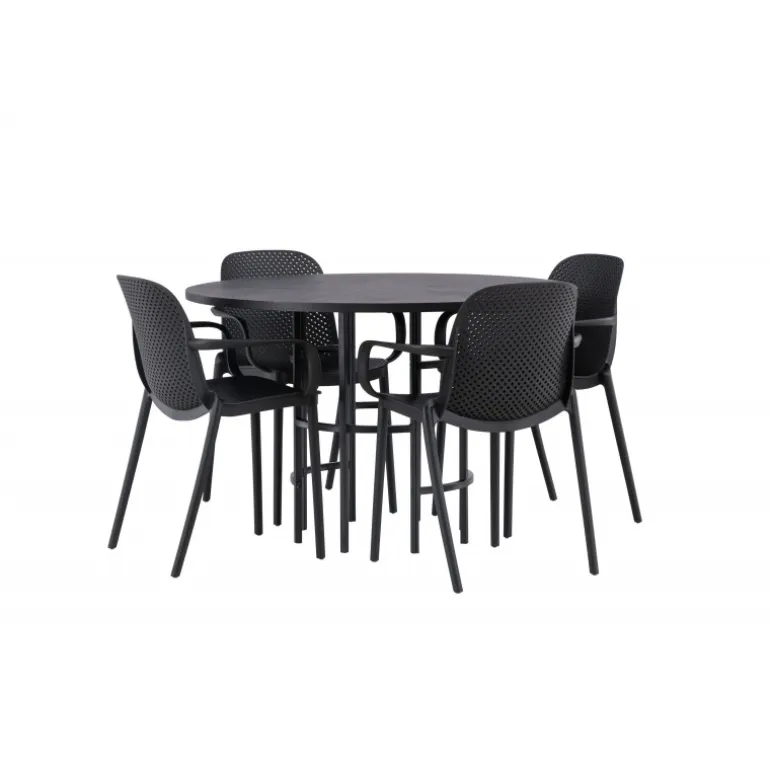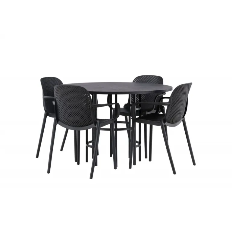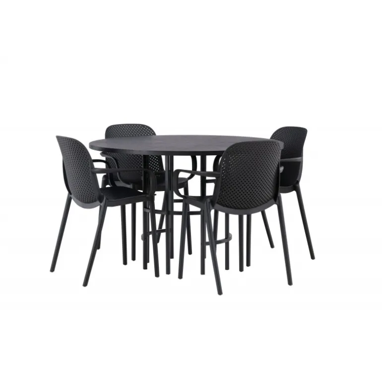 Her mødes industrielt design med bløde former! Vores runde spisebord, Copenhagen, har en elegant, sort bordplade i MDF og en dekorativ, cylinderformet base i sort metal. Her sammen med vores smarte spisebordsstole fra Baltimore-serien. Stolen er lavet af sort plastik og designet er trendy med lige nordiske former og integrerede armlæn for ekstra komfort. Sid komfortabelt og stilfuldt fremover! Bordets dimensioner: 115cm.