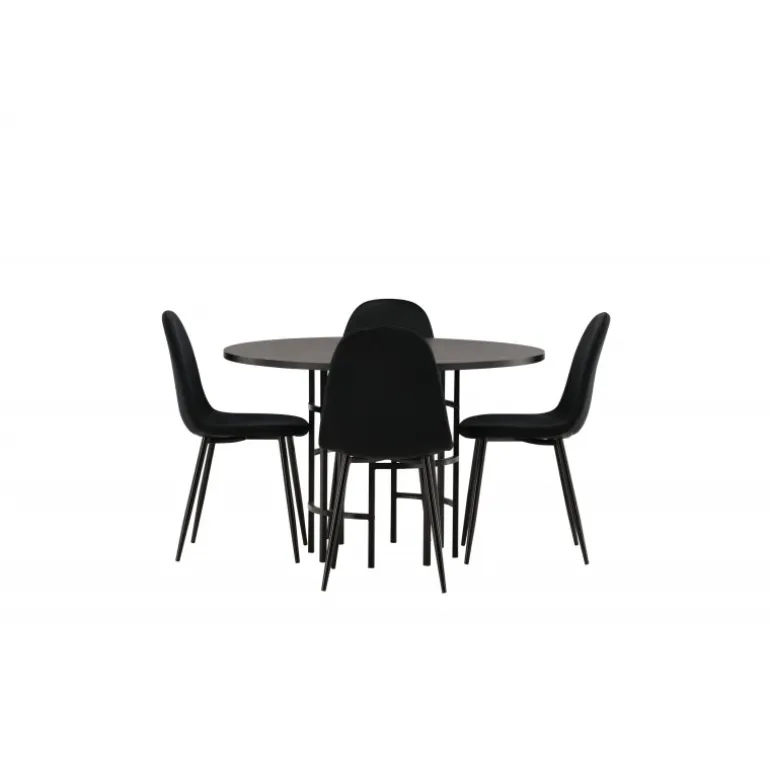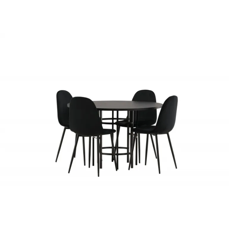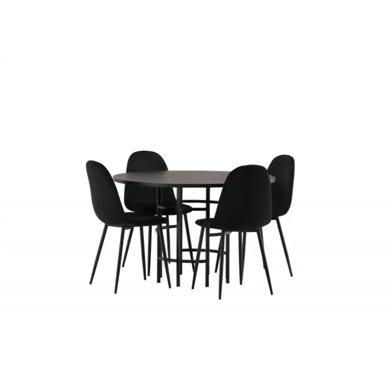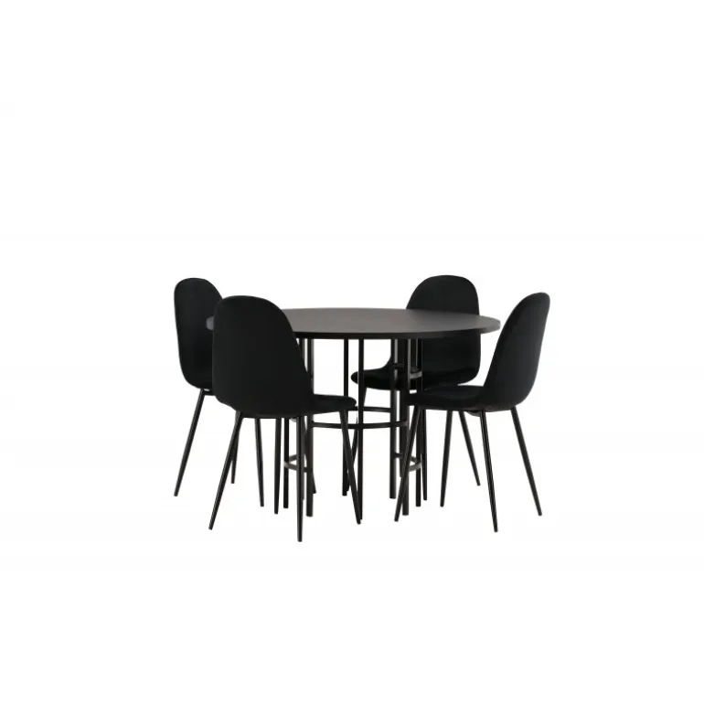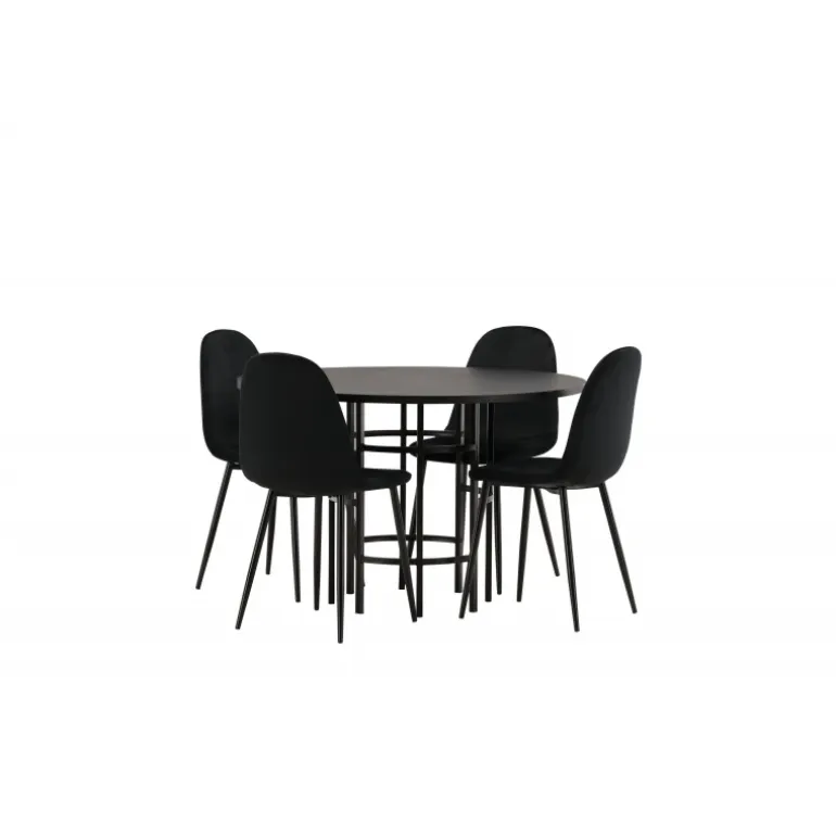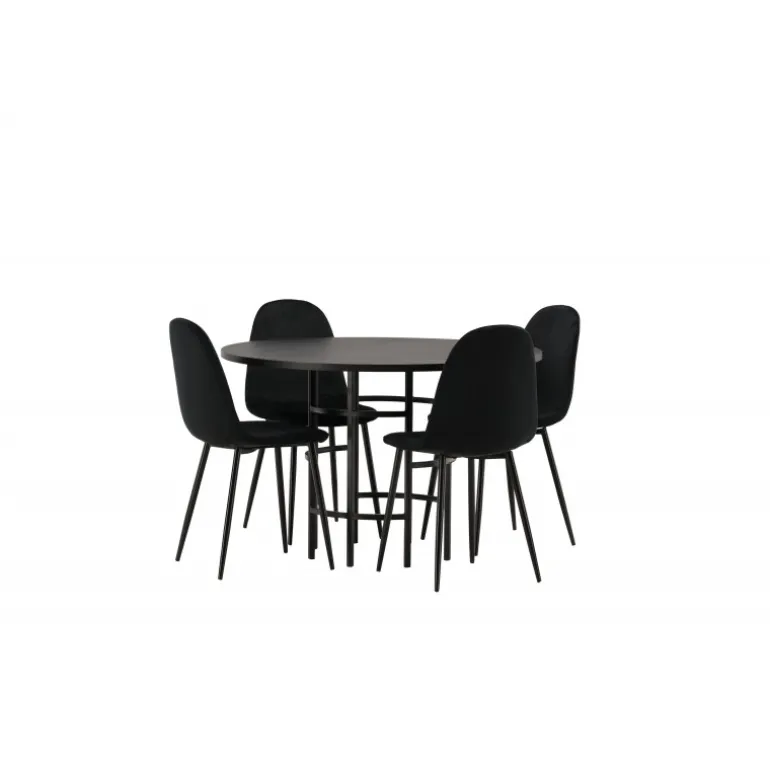Stilfuldt, moderne og tidløst – et Spisebordssæt, der imponerer dine gæster! Dette trend-sikre spisebord fra Copenhagen-serien tilhører Furniture Fashion-kollektionen og har en sodsort bordplade i MDF med finer og en dekorativ, cylinderformet base i sort metal. Sammen med vores komfortable spisebordsstole fra Polar-serien udgør det en harmonisk helhed. Stolen har et fuldt polstret design med en afrundet ryg og sæde i sort velourstof med blød polstring og ben i sort pulverlakeret metal. Undgå at gå på kompromis mellem komfort og design!