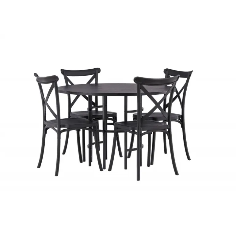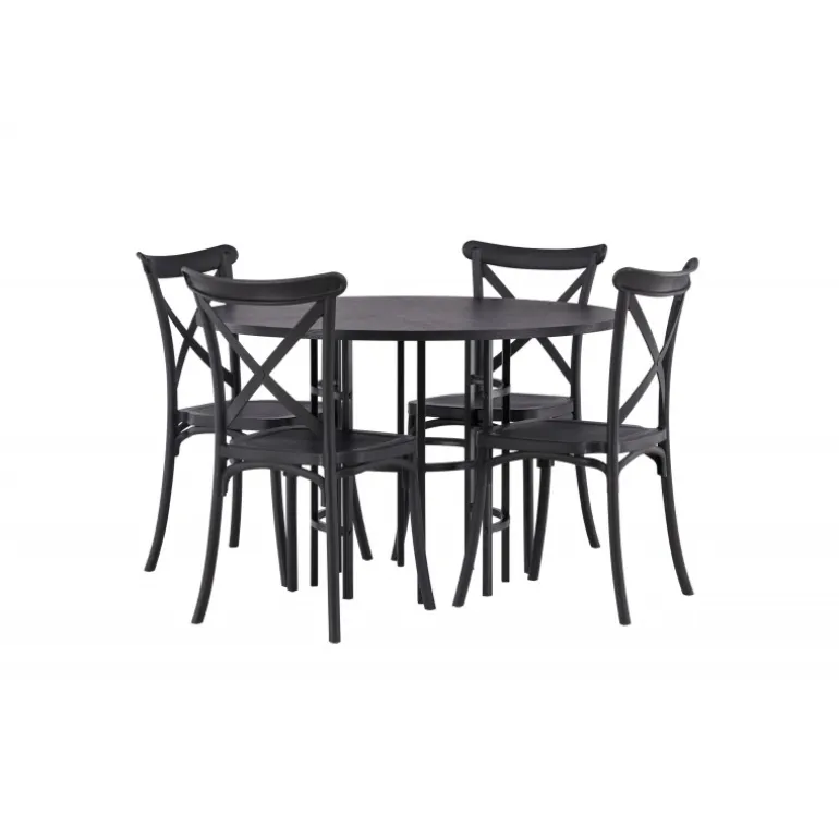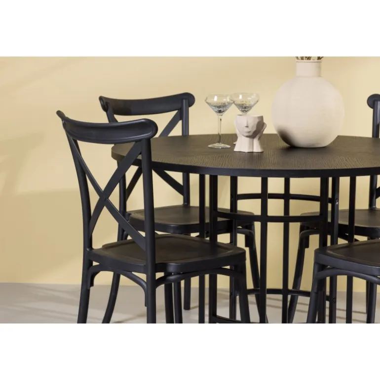 Det industrielle design beskriver dette Spisebordssæt perfekt! Vores runde spisebord Copenhagen har en elegant, sort bordplade i MDF og en dekorativ, cylinderformet base i sort metal. Her i stilfuld kombination med sorte spisebordsstole fra Crosett-serien. Stolen er konsekvent lavet af det praktiske materiale plastik og har en mat sort farve, der står tidens prøve. Lad tiden her være dagens højdepunkt! Bordets dimensioner: 115 cm.