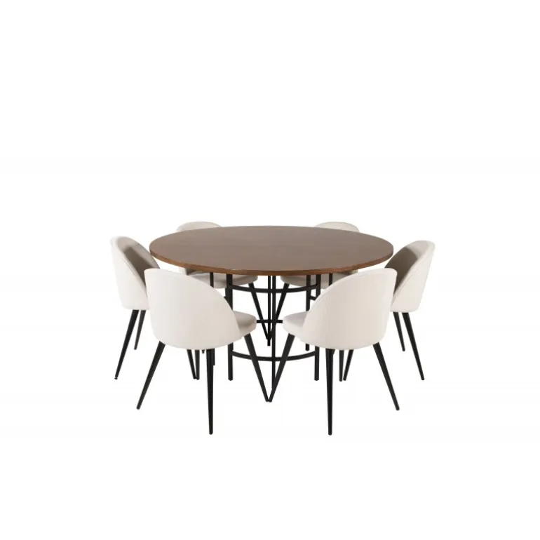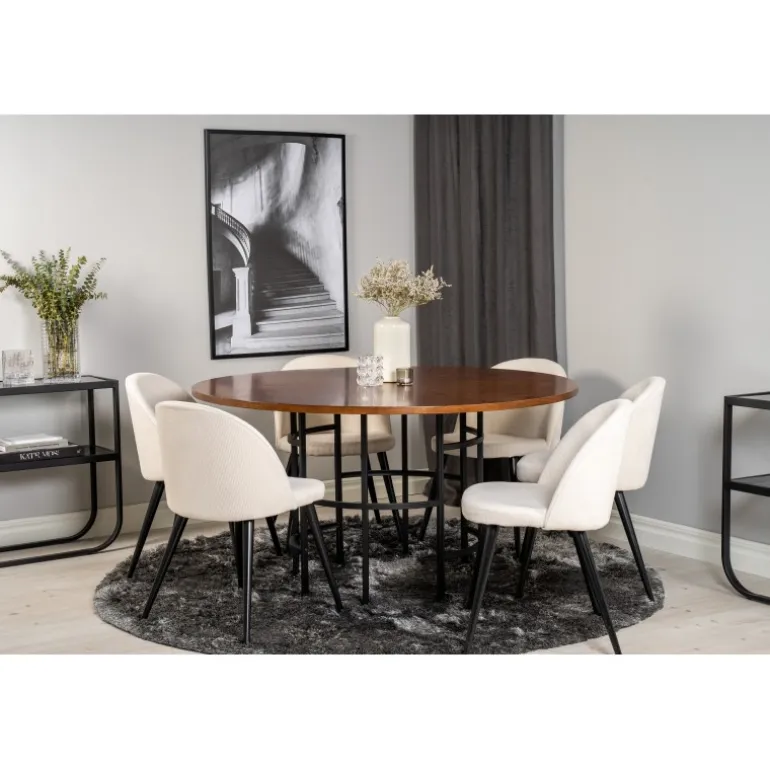 Spisebordet Copenhagen med en smuk brun bordplade og et dekorativt understel i sort metal sammen med vores komfortable spisestole i Velvet-serien giver dig en kombination af moderne, hyggeligt og luksuriøst! Perfekt til både dagligdags måltider og formelle middage.