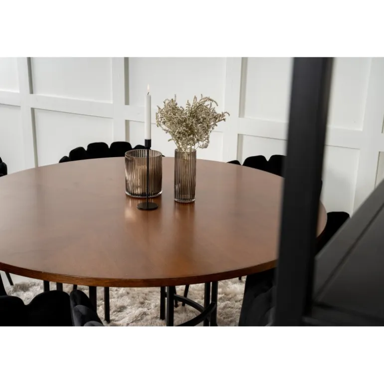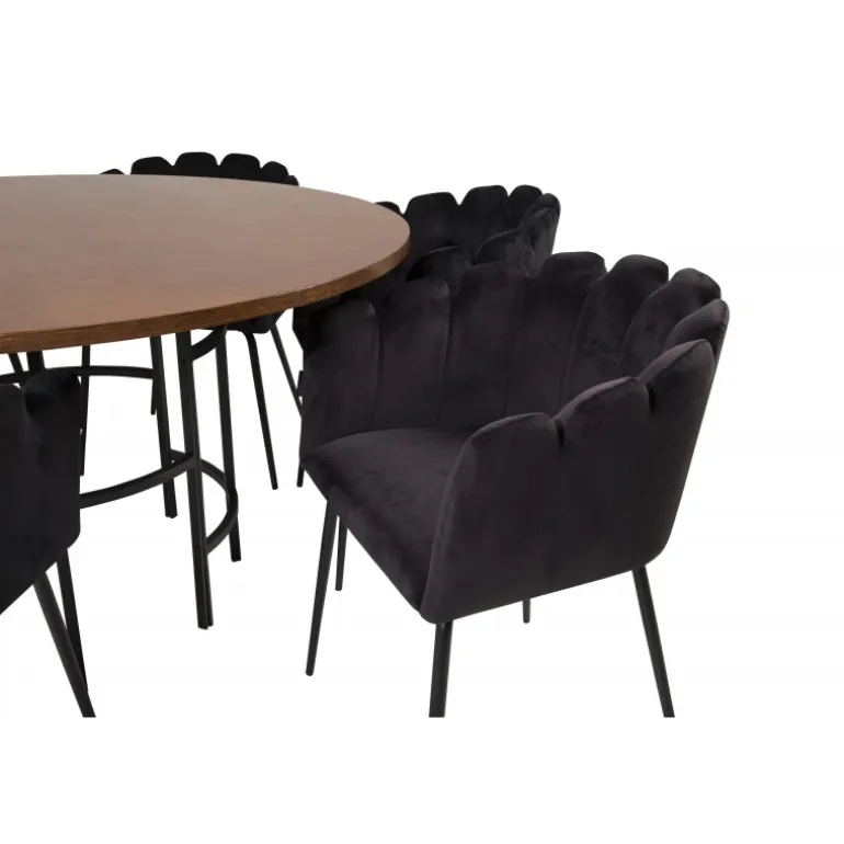 Elegant og pompøs! Rundt Spisebordssæt fra Furniture Fashion kollektionen. Gennemført sort udtryk, hvor de velourbetrukne stole møder en mørk trælignende bordplade, hvilket giver en luksuriøs følelse. Bordet Copenhagen sammen med de sorte velourstole i Limhamn-serien. Inviter til mange hyggelige familiemiddage!