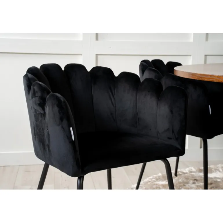 - Elegant Design: Gennemført sort udtryk med velourbetrukne stole og mørk trælignende bordplade.