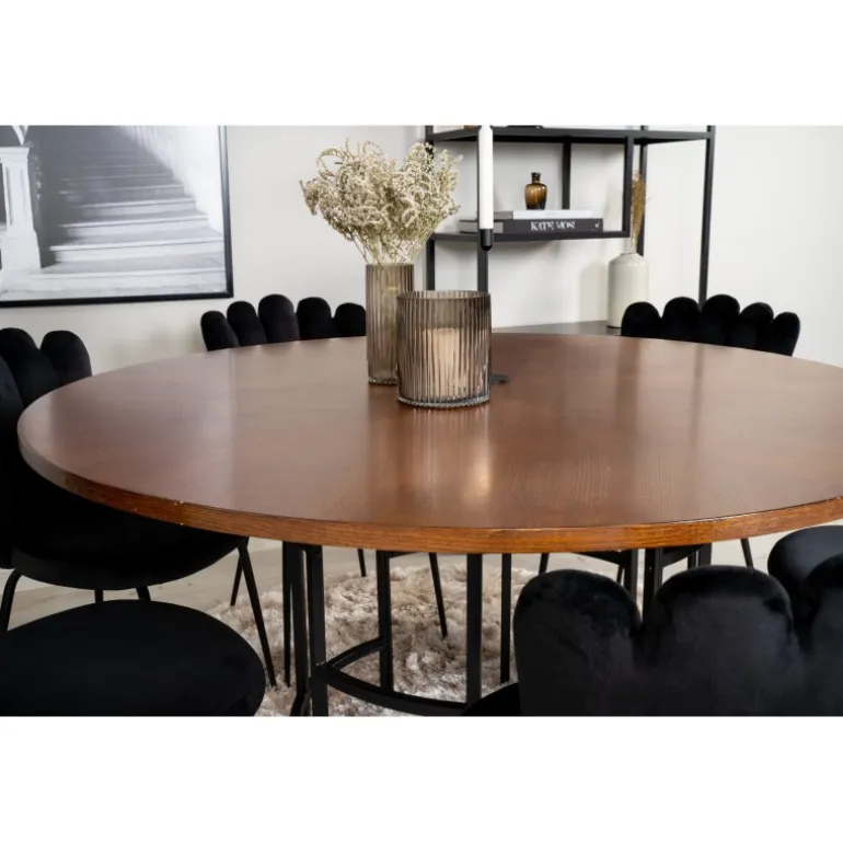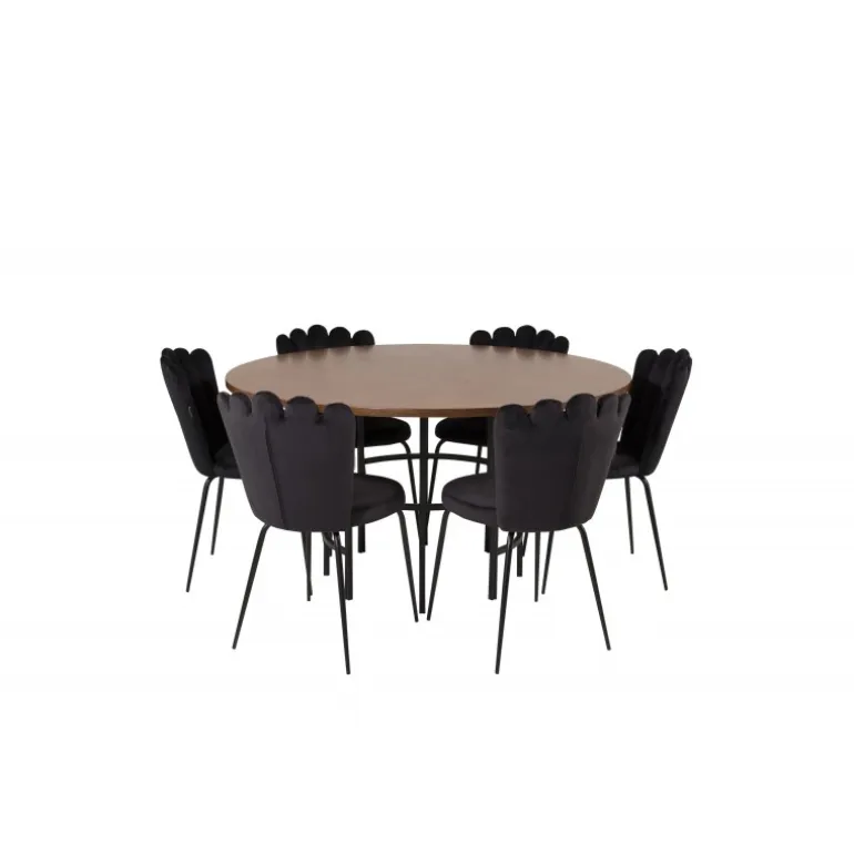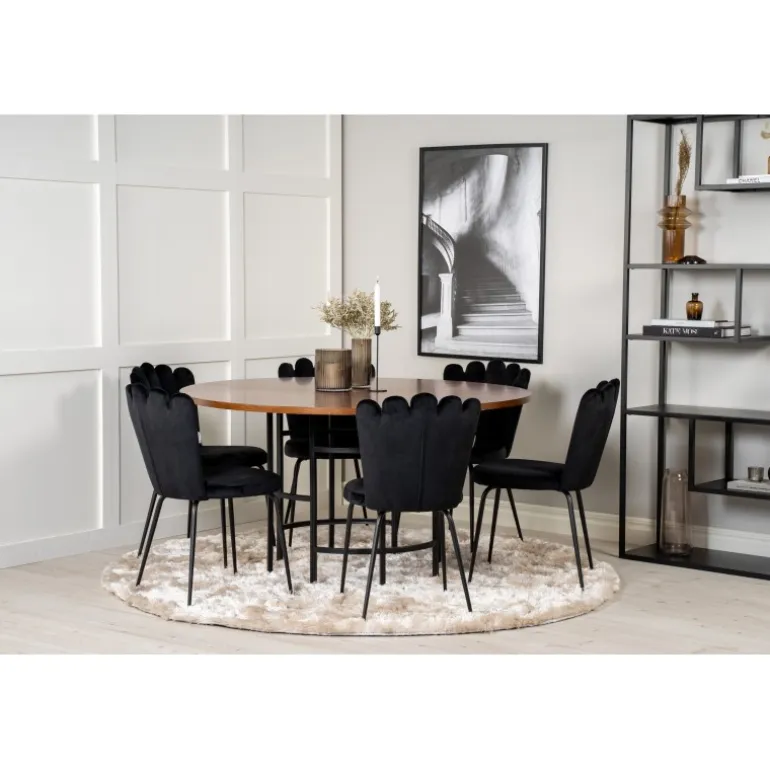 Oplev den elegante og pompøse charme ved Copenhagen Rundt Spisebordssæt! En del af den eksklusive Furniture Fashion-kollektion, der kombinerer sorte velourstole med en mørkebrun bordplade lavet af MDF, stål og finer. Dette sæt skaber en luksuriøs atmosfære i dit hjem. Bordet Copenhagen og de sorte velourstole fra Limhamn-serien tilbyder plads til mange gæster – perfekt til hyggelige familiemiddage.