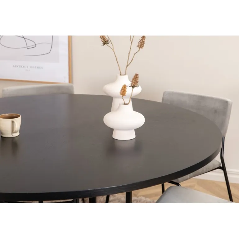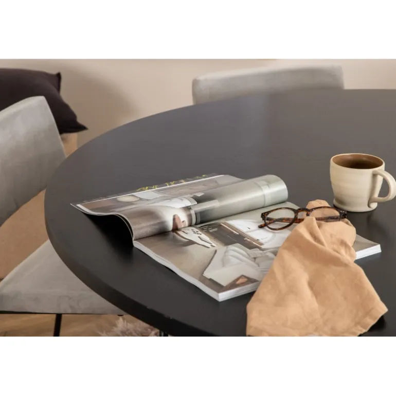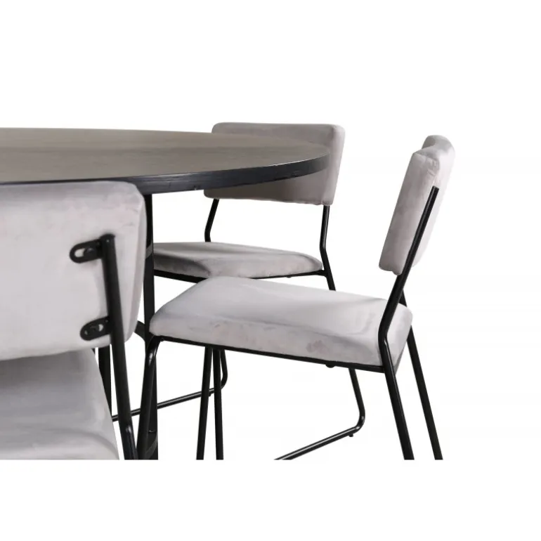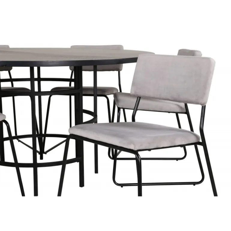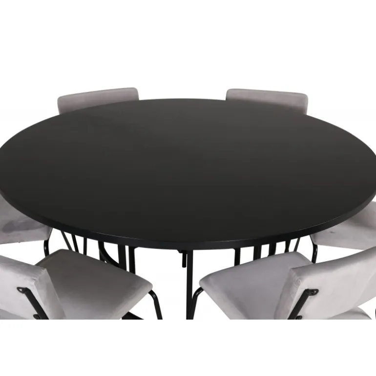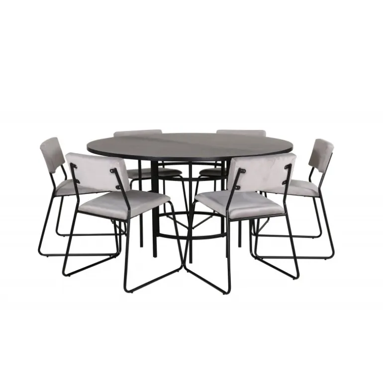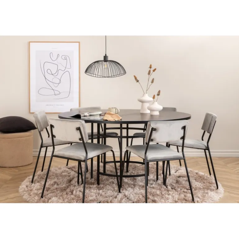 Kombiner det industrielle look med minimalistisk indretning! Copenhagen Spisebordssæt har et tidsløst design i konsekvent sort farve med en bordplade i MDF med finer og en dekorativ, cylindrisk formet metalunderstel. Bordets diameter: 140cm, Højde: 74cm. Matchet her med 6 stilfulde spisestole fra Kenth-serien. Stolens ben er smalle i jern, og de komfortable sæder er i lysegråt fløjlsstof. Stolens dimensioner: Højde: 76cm, sædehøjde: 48,5cm, bredde: 40cm, dybde: 52cm. Skab et charmerende midtpunkt at samle familie og venner omkring!