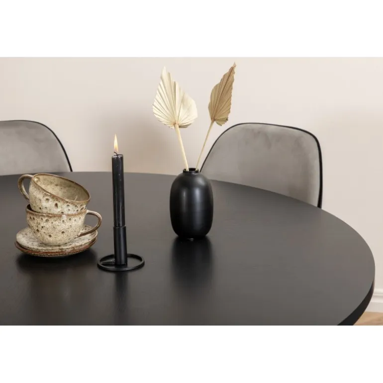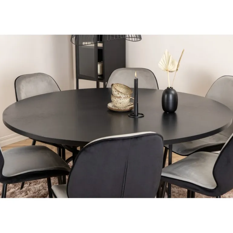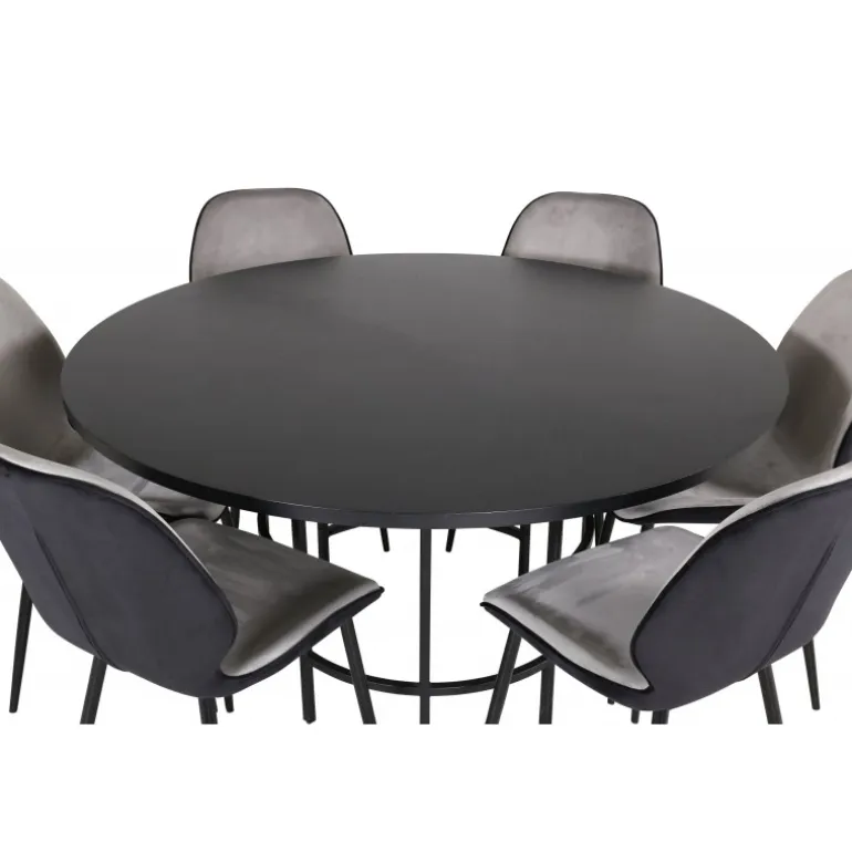 Copenhagen, vores populære runde spisebord med en smuk bordplade i sort MDF med finer og en dekorativ, cylindrisk formet understel i sort metal. Bordet er konsekvent i en elegant sort farve, som giver rummet et pompøst og stilfuldt udtryk, men som også er let at matche med anden indretning. Bordets diameter: 140 cm, højde: 74 cm. Her er det matchet med 6 Emma spisestole i moderne design. Stolens ben er i sort jern, og sæderne er i lysegrå og sort fløjl, hvilket giver en lækker varierende glans til rummet. Stolens dimensioner: Højde: 89 cm, sædehøjde: 45 cm, bredde: 47 cm, dybde: 57 cm.