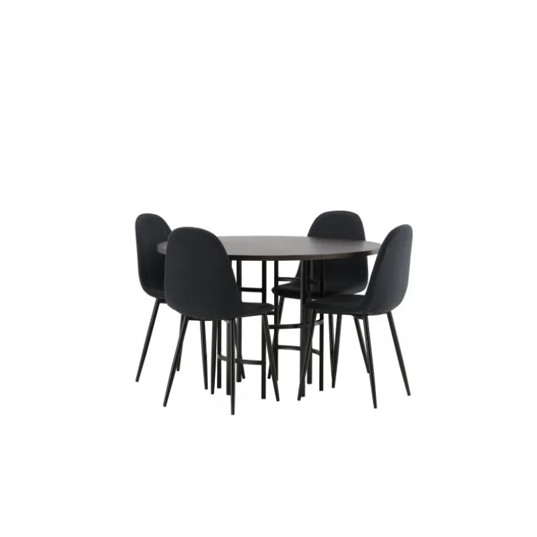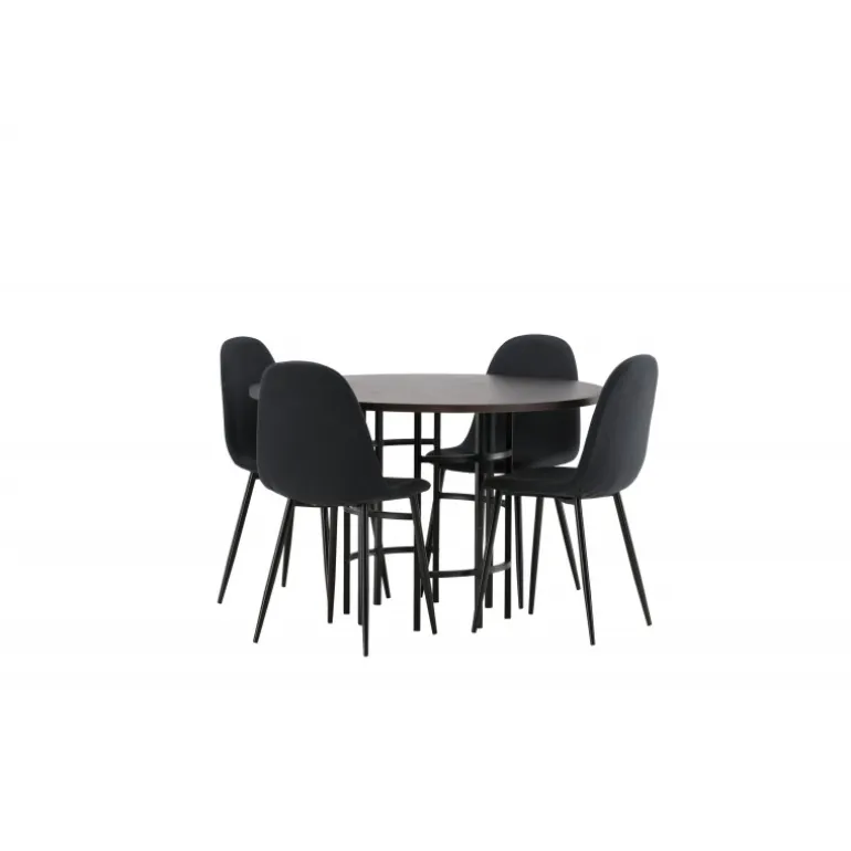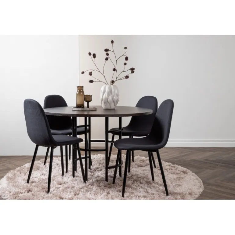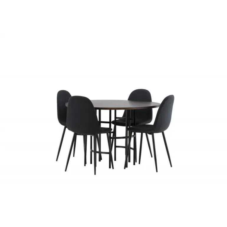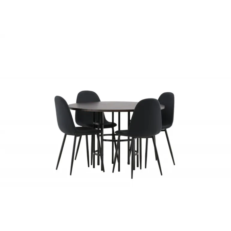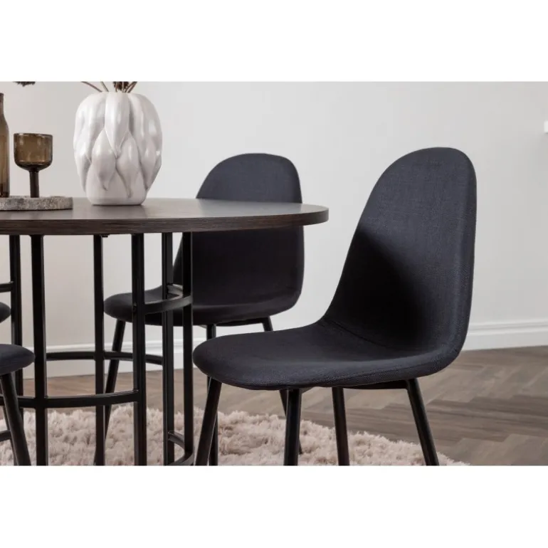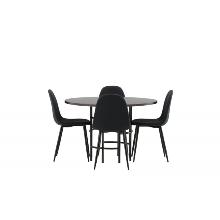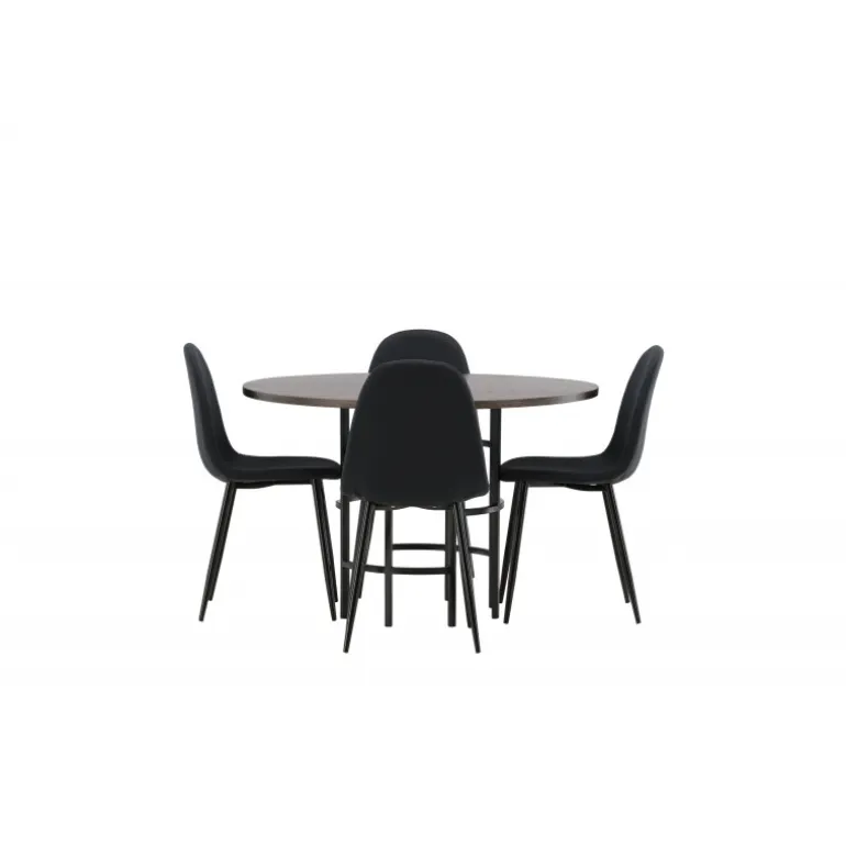 Stilfuldt, moderne og tidløst – et Spisebordssæt der imponerer! Dette trend-sikre spisebord fra Copenhagen-serien tilhører Furniture Fashion-kollektionen og har en smuk brun bordplade i MDF med finer og en dekorativ, cylinderformet base i sort metal. Her sammen med vores komfortable stole fra Polar-serien. Stolen har et fuldt polstret design med en afrundet ryg og sæde i sort polyesterstof med blød polstring og ben i sort pulverlakeret metal. Undgå at gå på kompromis mellem komfort og design!