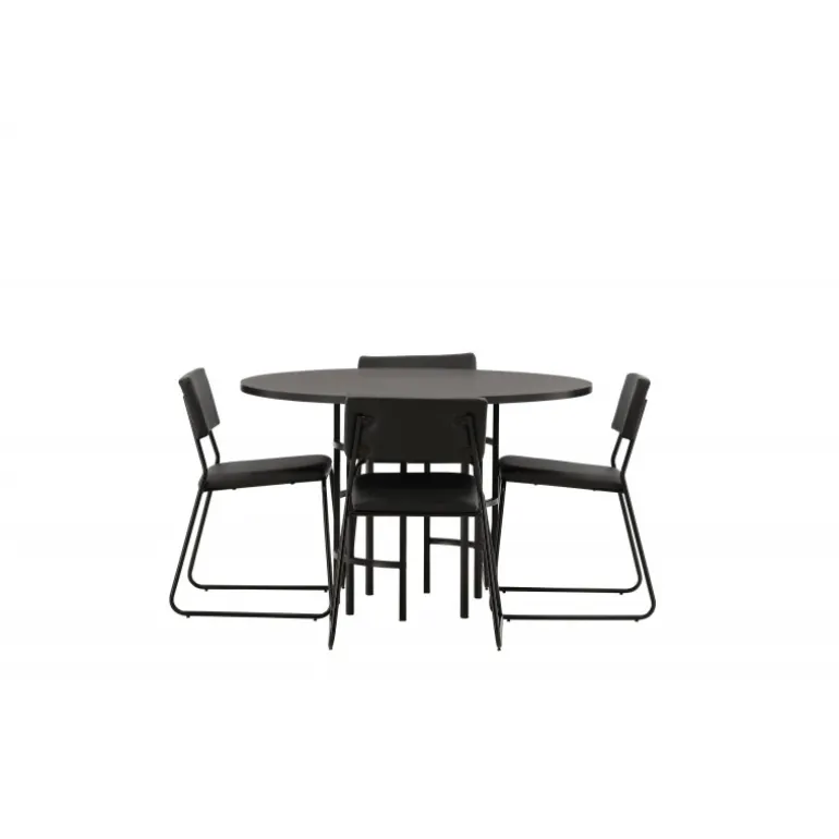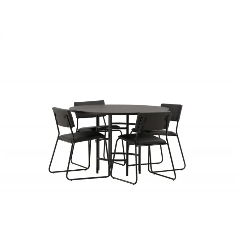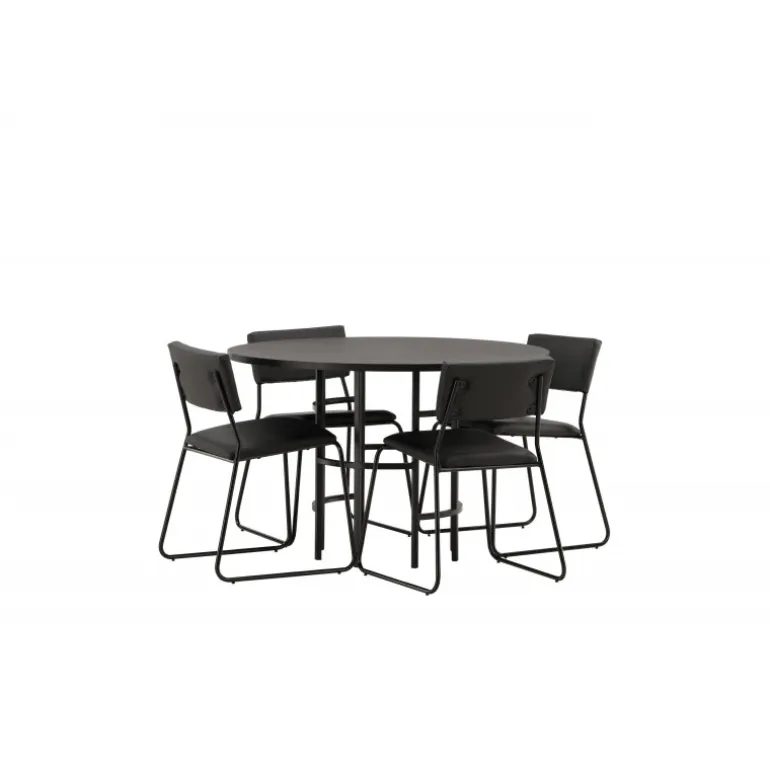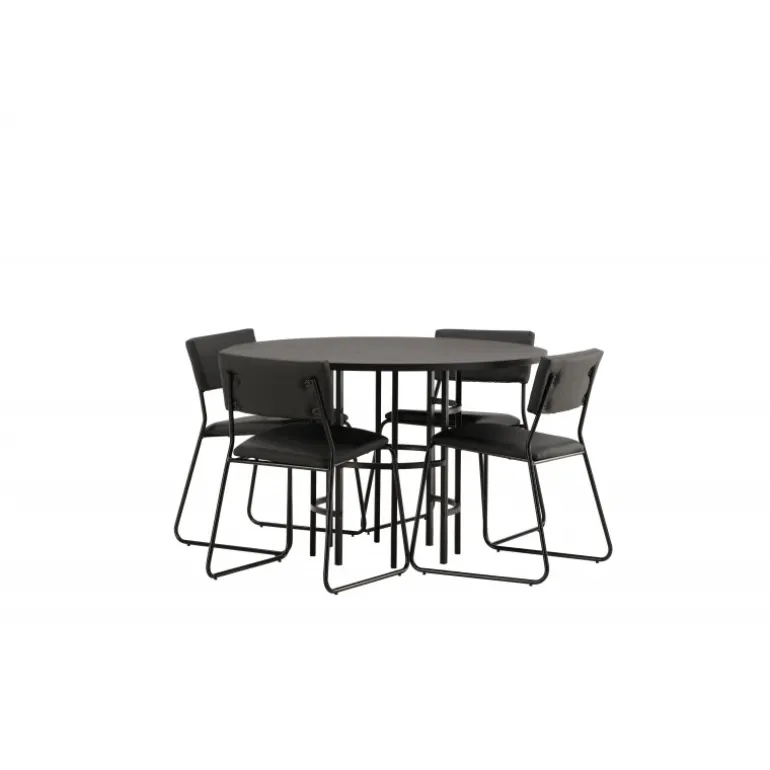 Skab en moderne atmosfære i dit hjem med et rundt spisebordssæt! Dette tidløse spisebord fra Copenhagen-serien tilhører Furniture Fashion-kollektionen og har en sodet sort bordplade i MDF med finer og en dekorativ, cylinderformet base i sort metal. Her sammen med vores moderne spisebordsstole fra Kenth-serien. Stolen har et minimalistisk, moderne design, der skaber en luftig følelse i rummet. Ryglænet og sædet er i sort PU-læder og polyester, og de smalle ben er i sort jern. Nyd hyggelige måltider i fremtiden!