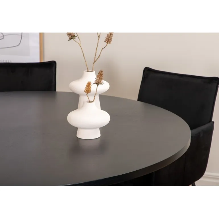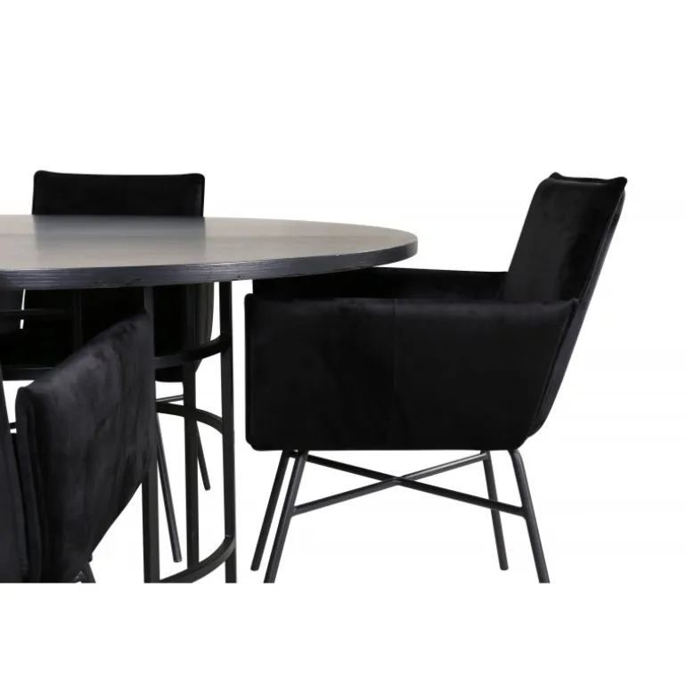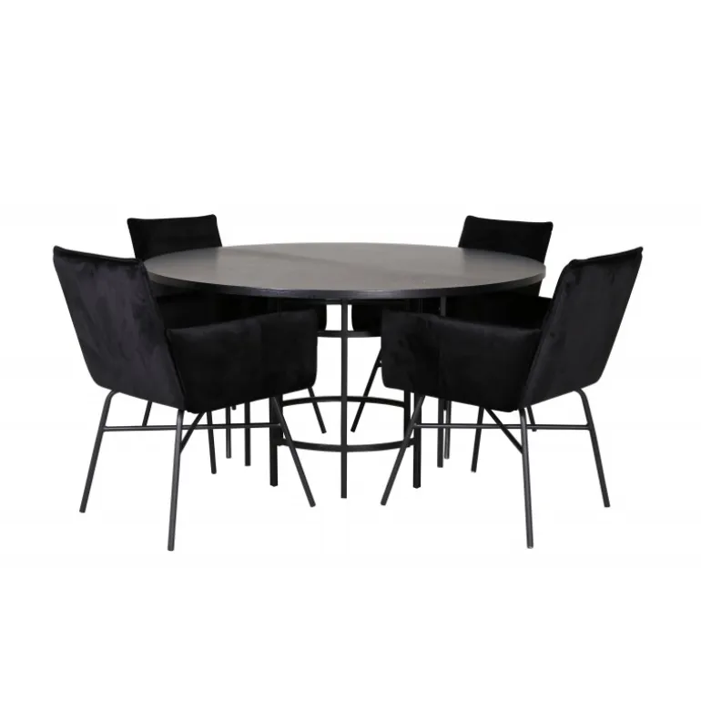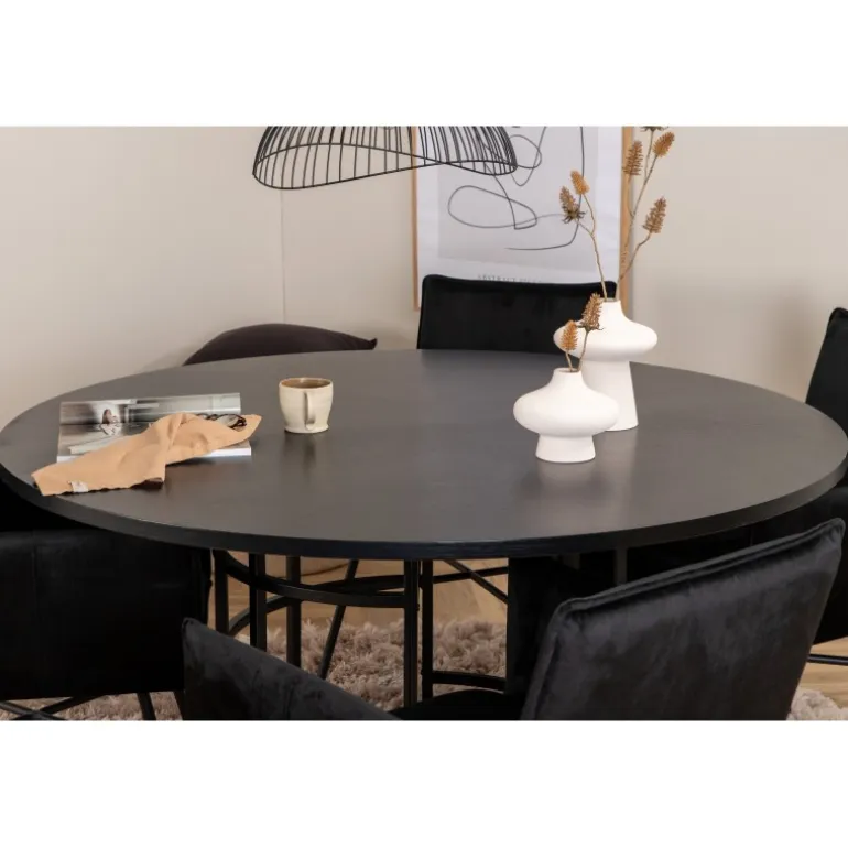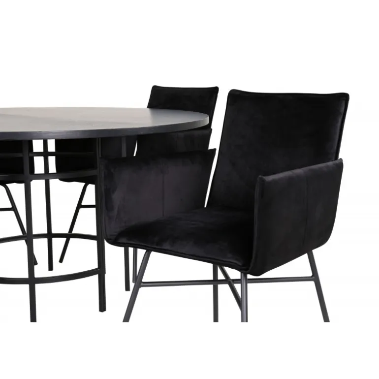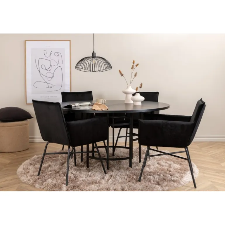 Copenhagen, vores populære runde spisebord med en smuk bordplade i sort MDF med finér og et dekorativt, cylindrisk understel i sort metal. Bordet er konsekvent i elegant sort farve, hvilket giver rummet et pompøst og smart udtryk, men også let at matche med anden indretning. Borddiameter: Diameter: 140cm, Højde: 74cm. Her er det matchet med 4 Petra spisestole i luksuriøst design. Stolene har en behagelig sædedybde med sæde i sort fløjl og smalle stoleben i jern. Stoldimensioner: Højde: 87cm, sædehøjde: 48cm, bredde: 57cm, dybde: 60cm. Et behageligt madgruppe til alle lejligheder!