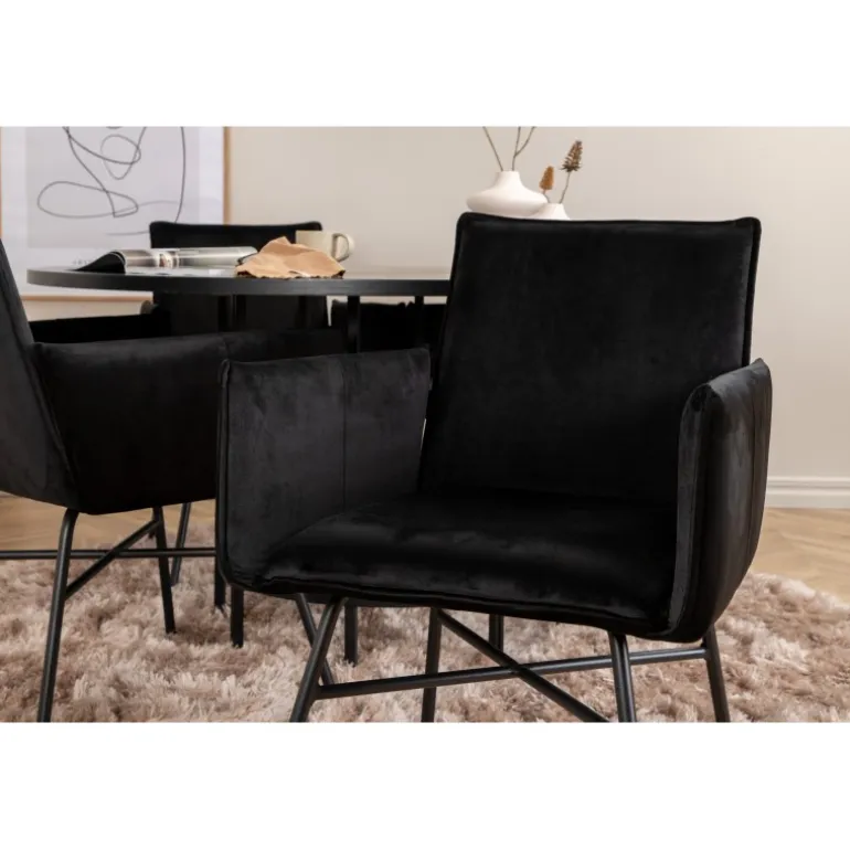 - Luksuriøse stole: Petra spisestole med sort fløjlssæde og jernben.
