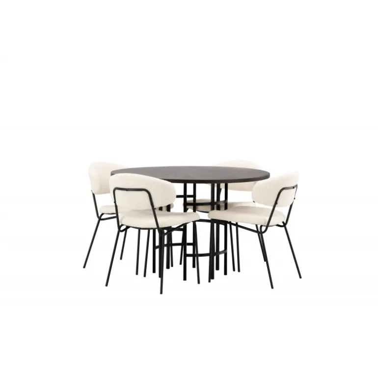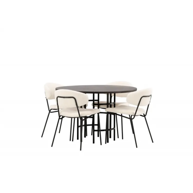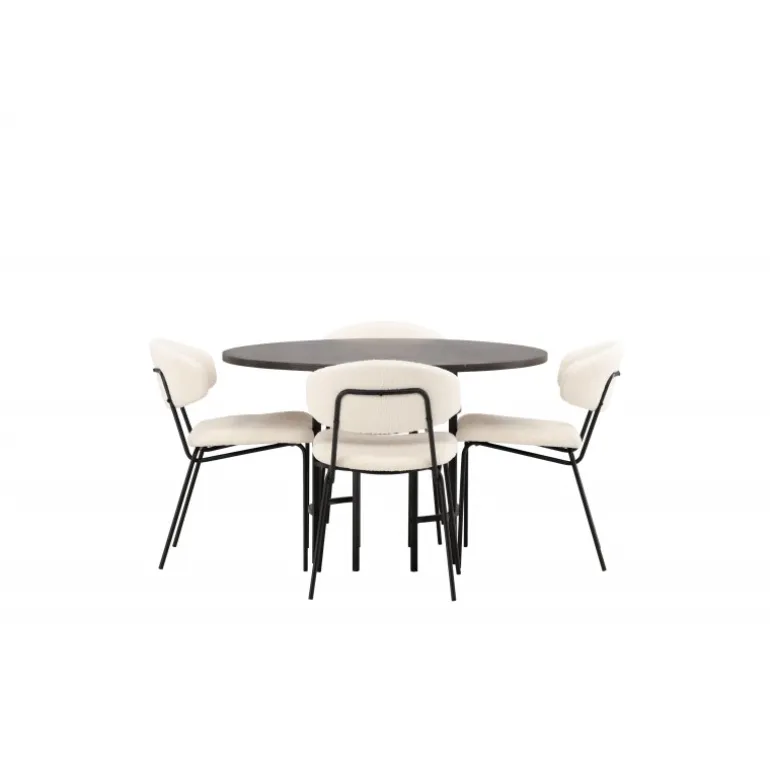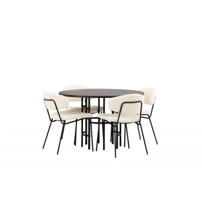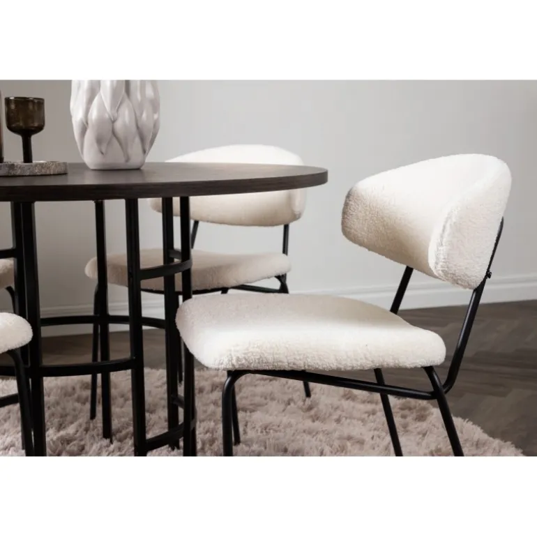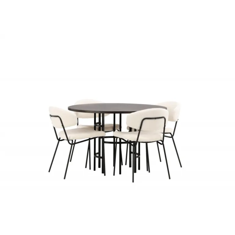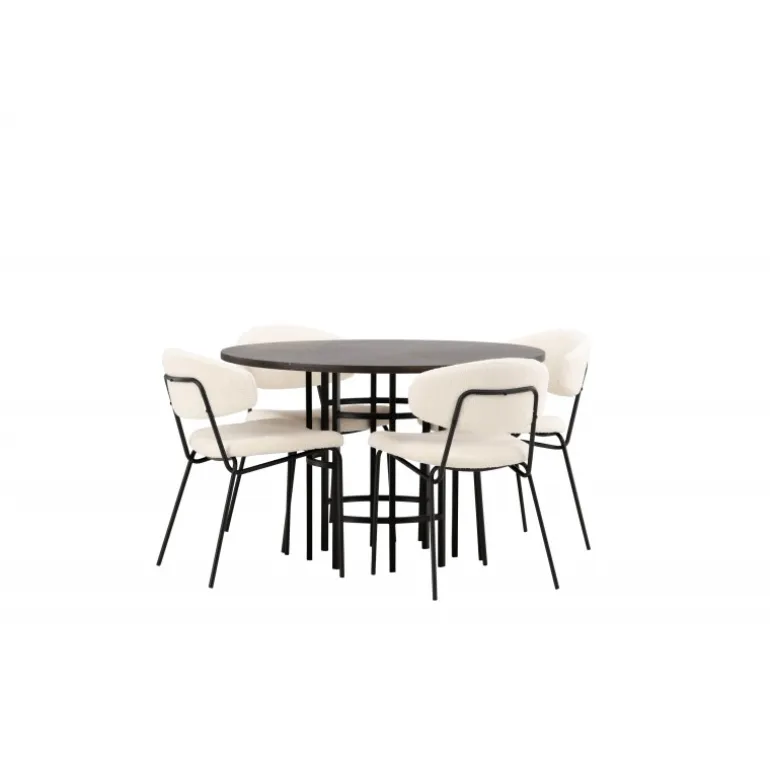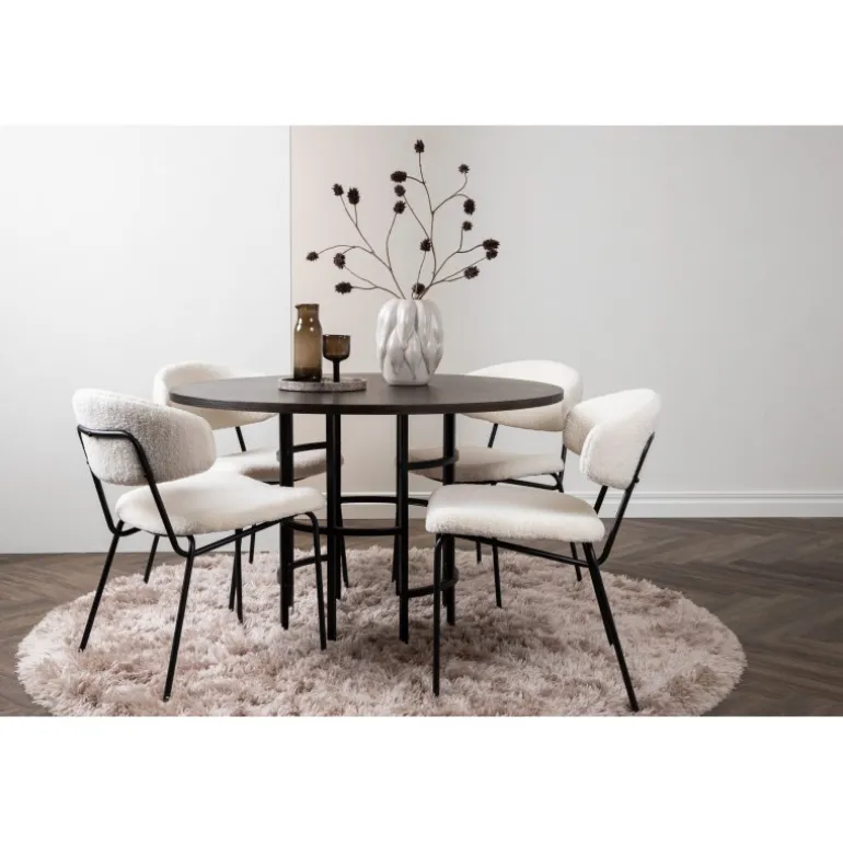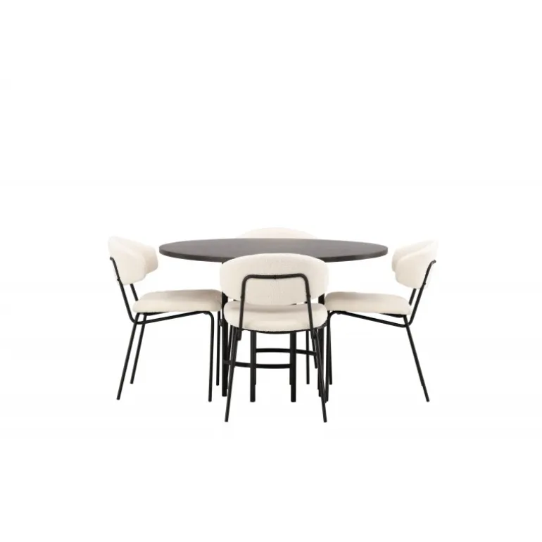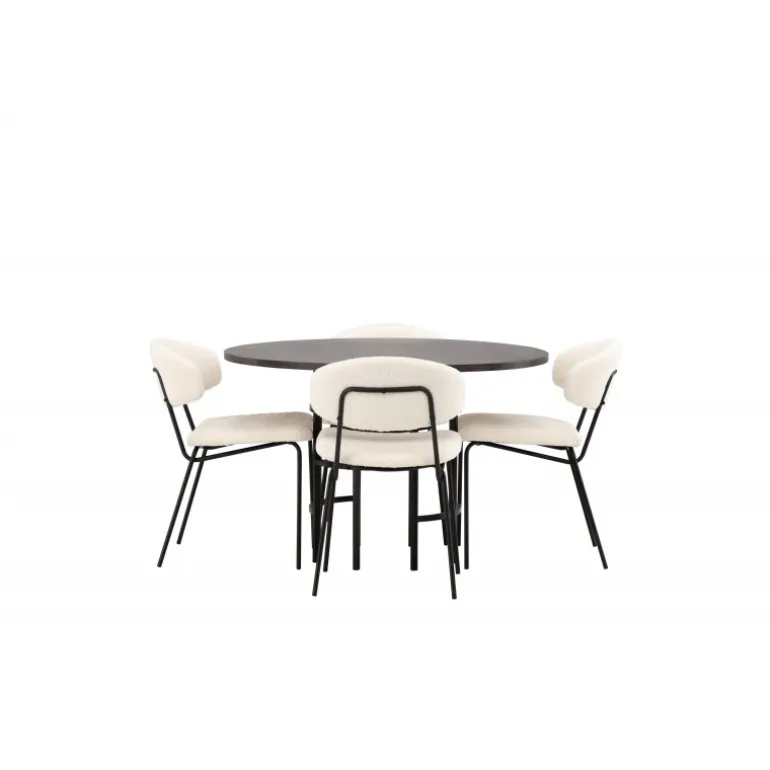 Skab en moderne og indbydende atmosfære i dit hjem med Copenhagen Rundt Spisestuesæt! Dette hyggelige sæt fra Copenhagen-serien er en del af Furniture Fashion-kollektionen og byder på et smukt brunt bord i MDF med finer og en dekorativ, cylinderformet base i sort metal. Sammen med vores dejlige stole fra Chico-serien, der har et minimalistisk og komfortabelt design med ryg og sæde i hvidt bouclé-stof og en smal ramme i sort stål, får du et blændende midtpunkt til at imponere dine gæster!