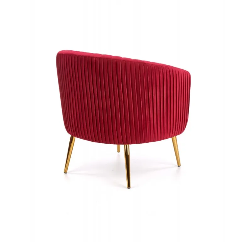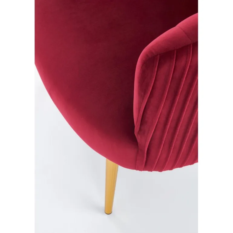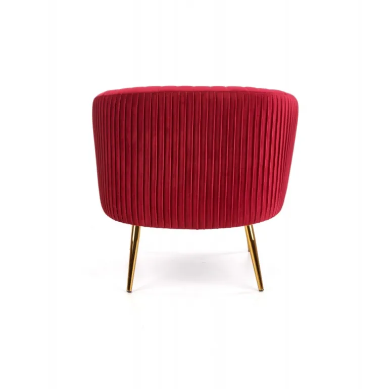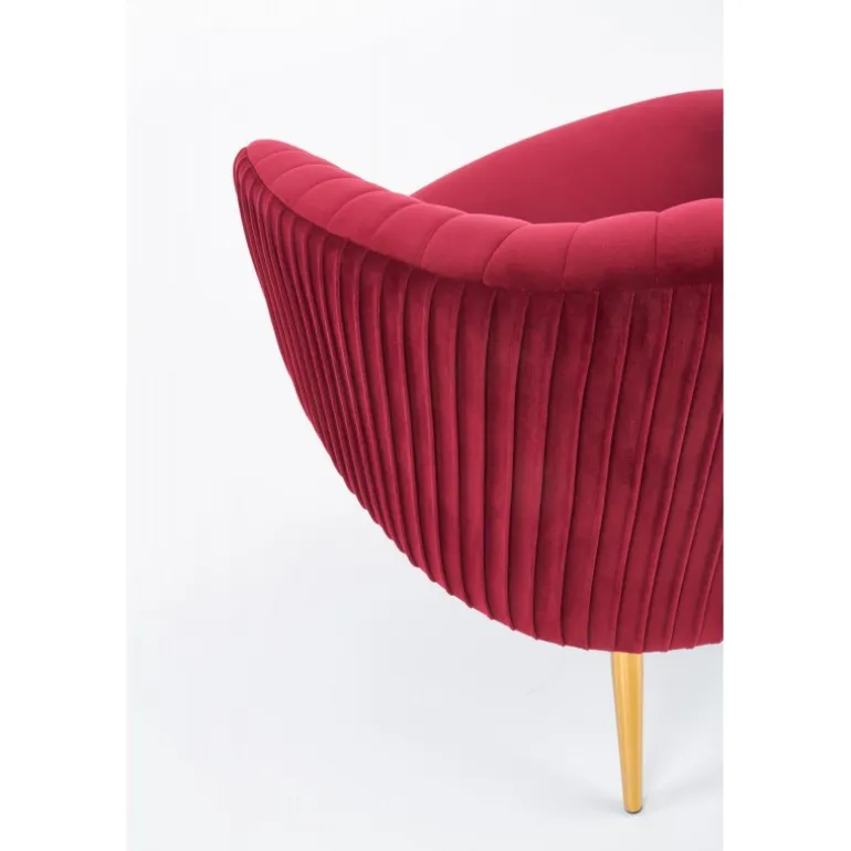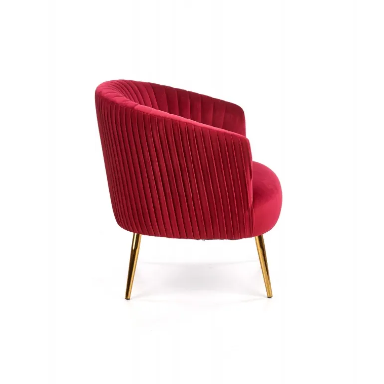 - Elegant design: Mørkerød polstring med guldfarvede ben.
