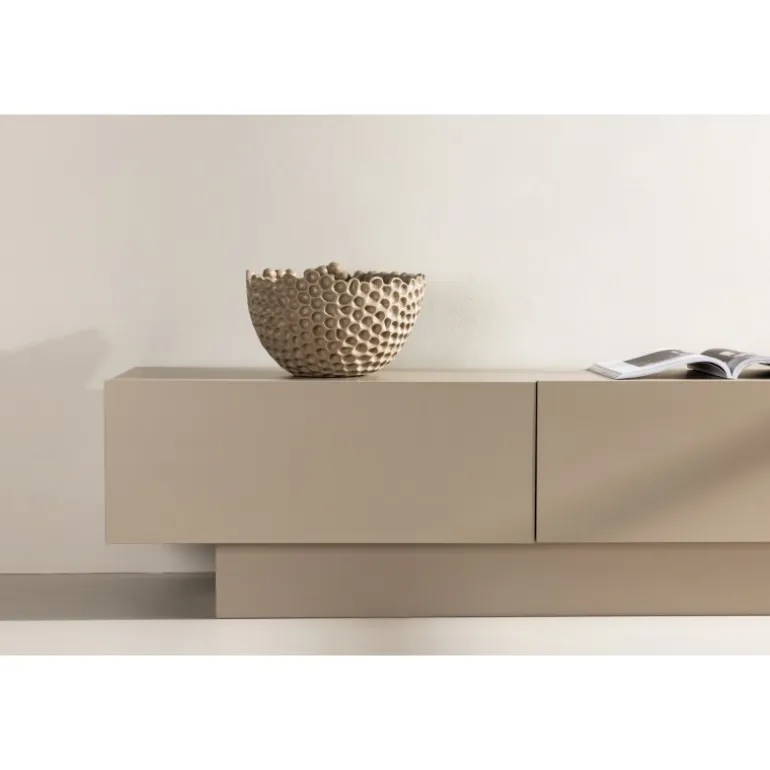 Skab et hyggeligt hjørne ved sofagruppen og dekorer med en elegant TV-bænk i beige/brune nuancer fra Cuenca-serien! Fremstillet med omhyggeligt design i en varm lys brun melaminfarve, tilføjer denne TV-bænk et moderne touch til dit interiør samtidig med, at den giver en smart opbevaringsløsning ved siden af sofaen. Nyd godt af den praktiske skabsdør, en skjult opbevaringsmulighed hvor du nemt kan organisere dine ejendele og TV-tilbehør. Den skjulte glashylde understøtter, hvad du ønsker at opbevare og skaber også plads til mere med sit smarte design. Dernæst kan du pynte topfladen for et hyggeligere og mere moderne udseende. Pynt den med lysestager, bøger eller en lille plante for at tilføje liv og bevægelse til fokuspunktet. Her er din mulighed for at skabe en atmosfære, der passer præcis til din stil, hvilket får dig til at føle dig omgivet af komfort og elegance. Den robuste, centralt placerede base tilbyder ikke kun stabil støtte til din bænk, men hæver også rummet og gør støvsugning til en let opgave. Elegant, moderne og tidløs – Cuenca TV-bænk sætter en ny standard for både opbevaring og design!