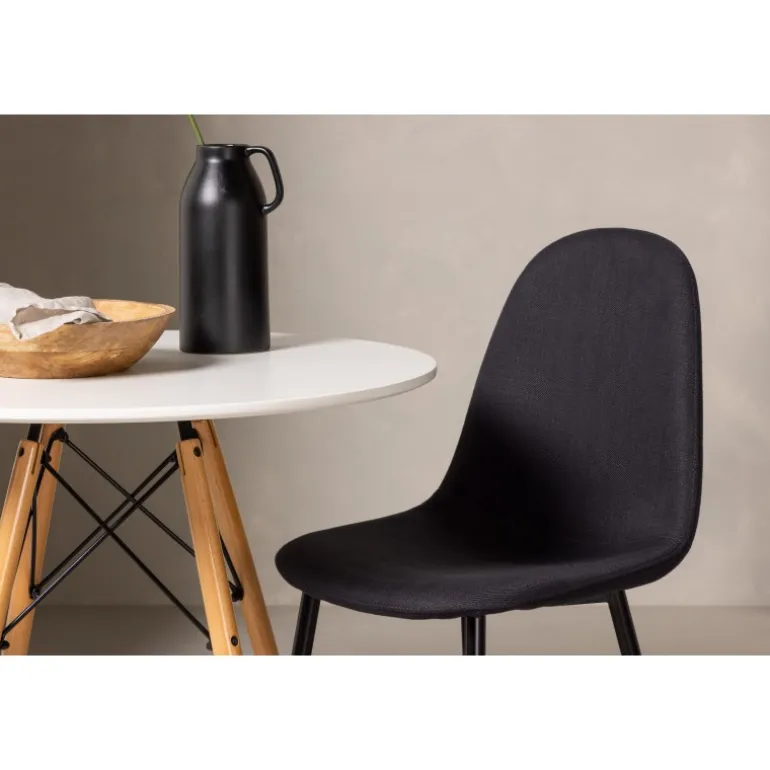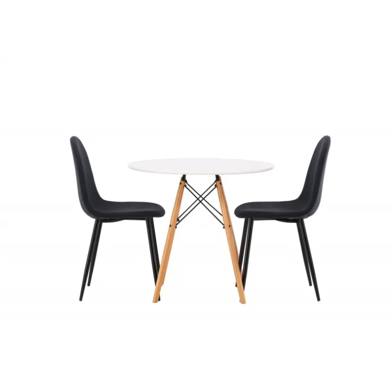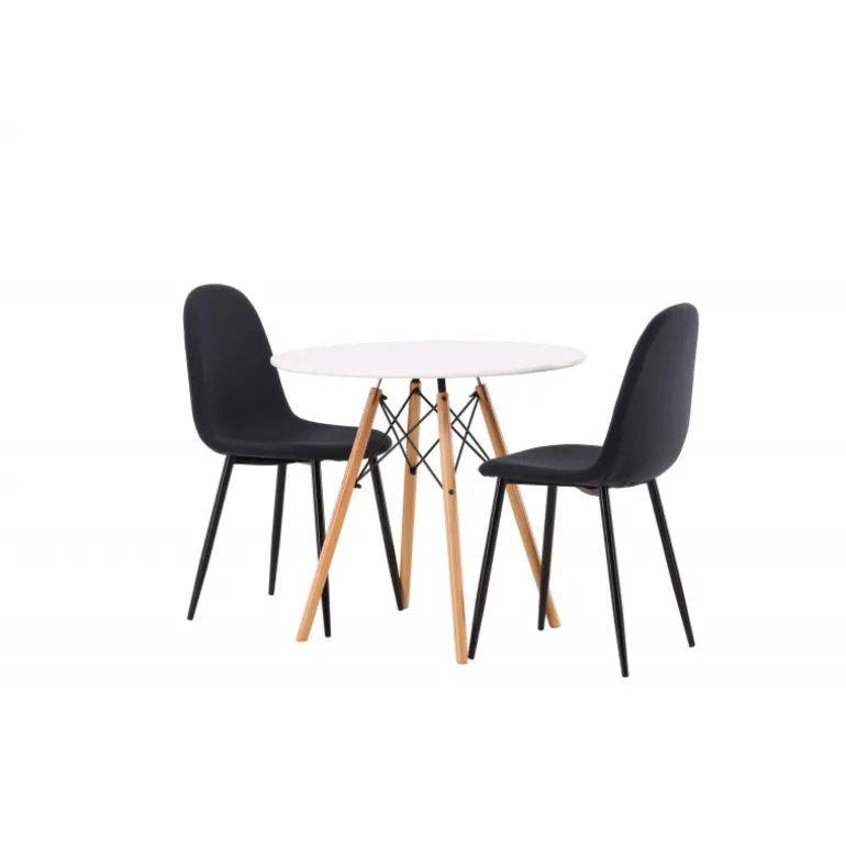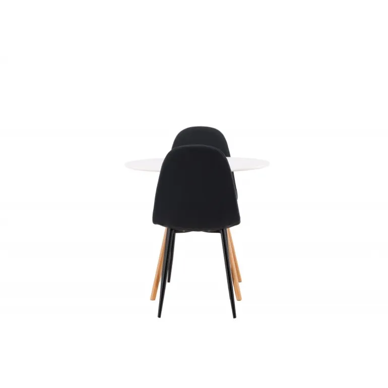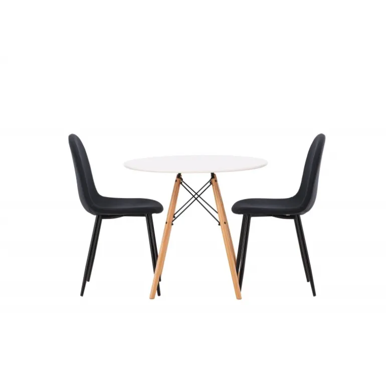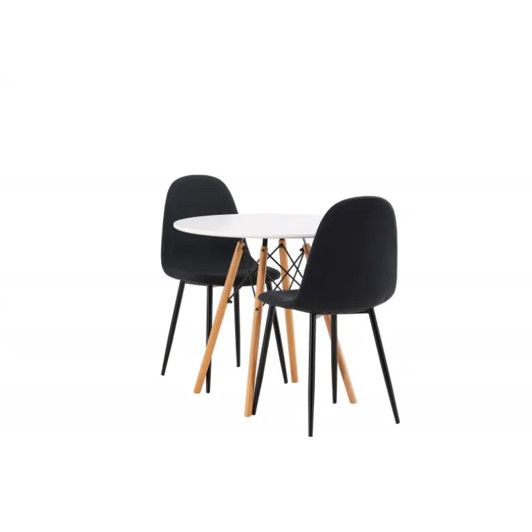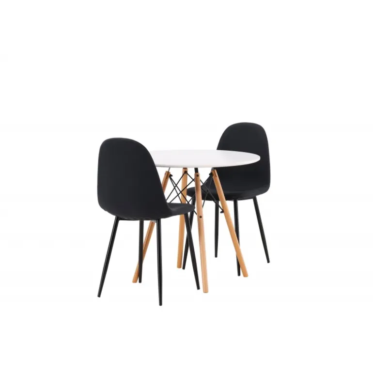 Sid både smart og komfortabelt! Det runde spisebord Danburi har et klassisk design med en rund bordplade i hvid MDF og let udadgående ben i bøgetræ med dekorative detaljer i sort stål. Her i en fantastisk kombination med sorte spisebordsstole fra Polar serien. Stolen har et fuldt polstret design, ben i sort pulverlakeret metal og en rundet ryg og sæde i sort polyesterstof med blød polstring. Dette sæt passer perfekt i det mindre køkken! Bordets diameter: 60 cm.