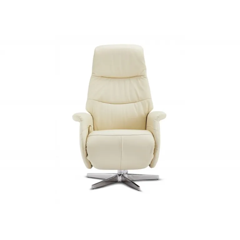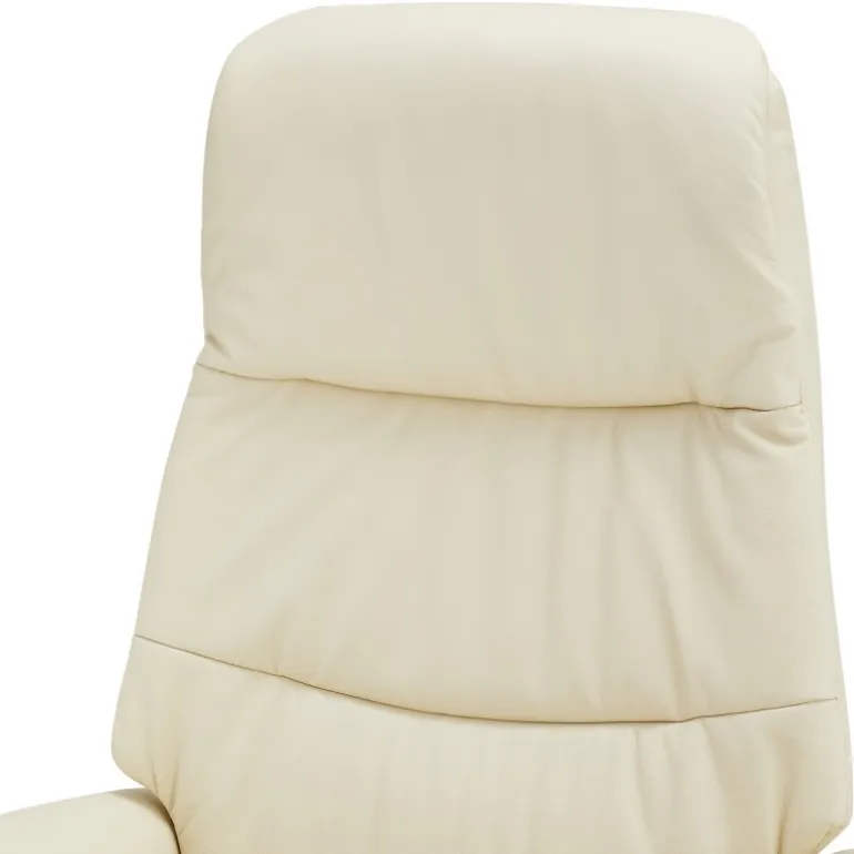 Delta Recliner i Cream læder er en elegant og komfortabel lænestol med manuelle funktioner. Den er betrukket med en kombination af ægte læder og PVC for et eksklusivt udtryk, men til en overkommelig pris. Med sin drejefunktion, justerbare nakkestøtte og integreret fodskammel er denne stol ideel til afslapning i hjemmet.
