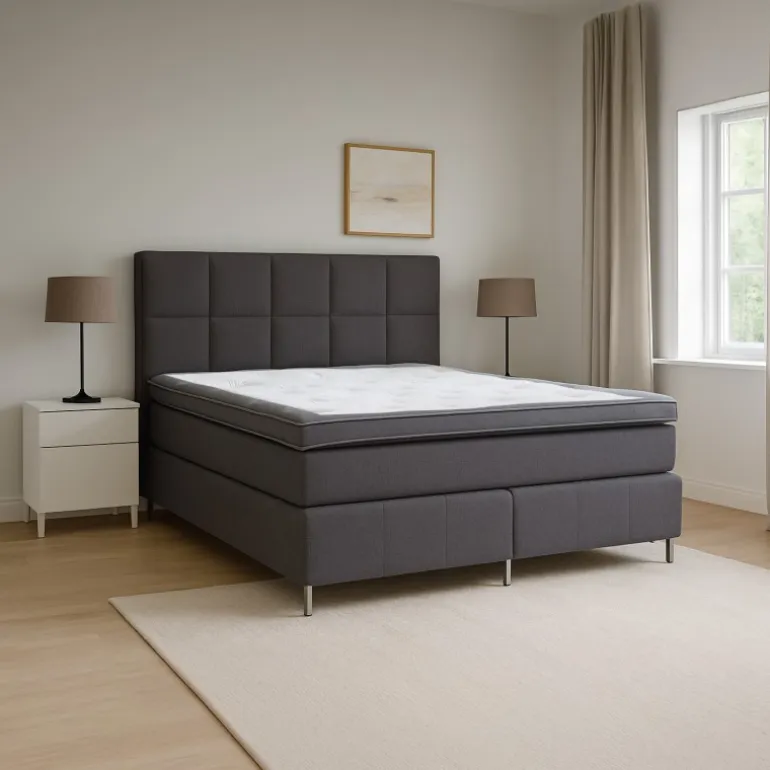 - Samlet komforthøjde ca. 70 cm (bund 28 cm + madras 19 cm + top 8 cm + ben 14,5 cm)